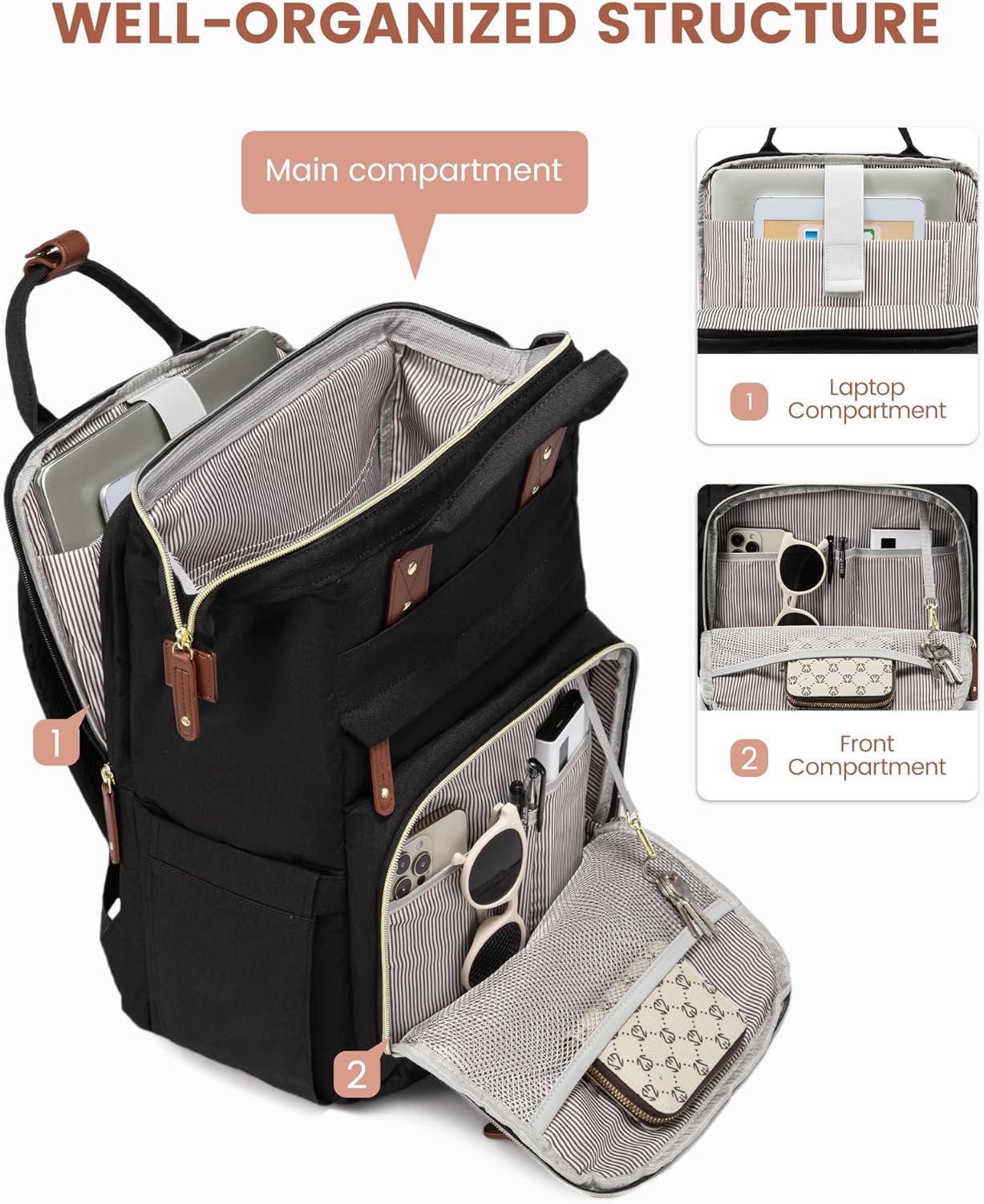 ORGANIZED WORK BACKPACK FOR WOMEN: Equipped with 22 pockets and 4 compartments, this work bag for women keeps your items well-organized. The independent padded electronic compartment protects your laptop and tablet, enhancing comfort during travel. The front utility pocket, complete with a key leash, allows you to quickly access smaller items and prevents you from losing your keys.