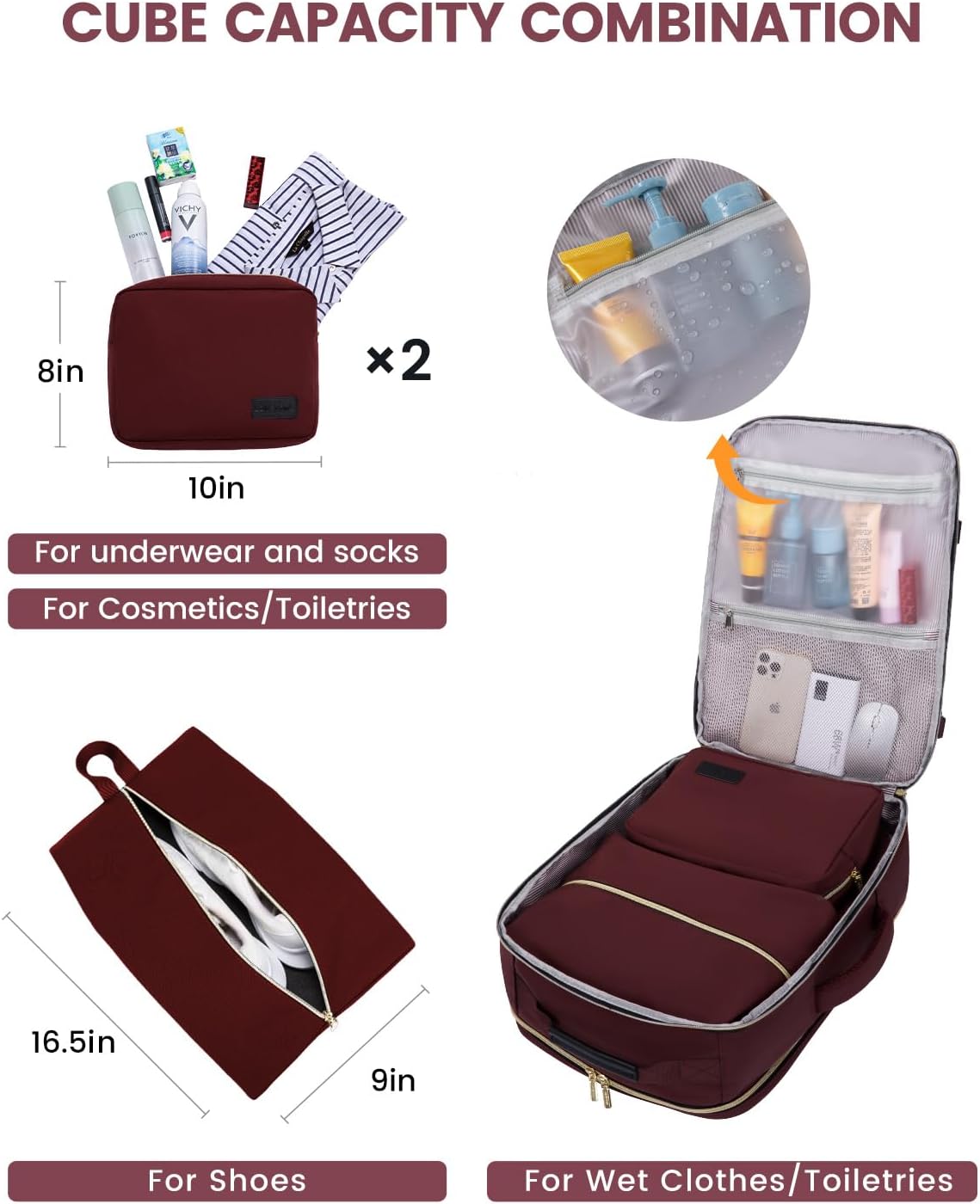 【3 Extra Packing Cubes & Wet Pockets】This carry-on bag includes 3 extra packing cubes – 2 storage bags and a shoe bag – as well as a built-in wet compartment pocket. Perfect for storing wet clothes, towels, and toiletries, these packing accessories ensure your belongings remain dry and prevent any leaks or moisture from affecting your other items.
