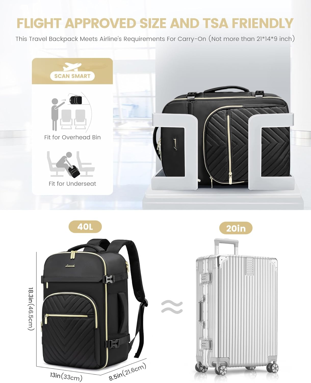 🛫AIRLINE APPROVED & TSA FRIENDLY🛫 – 18.3*13*8.5inch, 2.49lb, the carry on backpack meets most international carry-on requirements, such as Spirit, Frontier, Jet Blue, Easy Jet, and other budget-friendly airlines. Fits under the seat or in the overhead bin, making it the perfect personal item travel bag for air travel. At checkpoint, unfolds the laptop compartment freely 90-180 degrees making you quickly through the airport security and keep other items tidy.