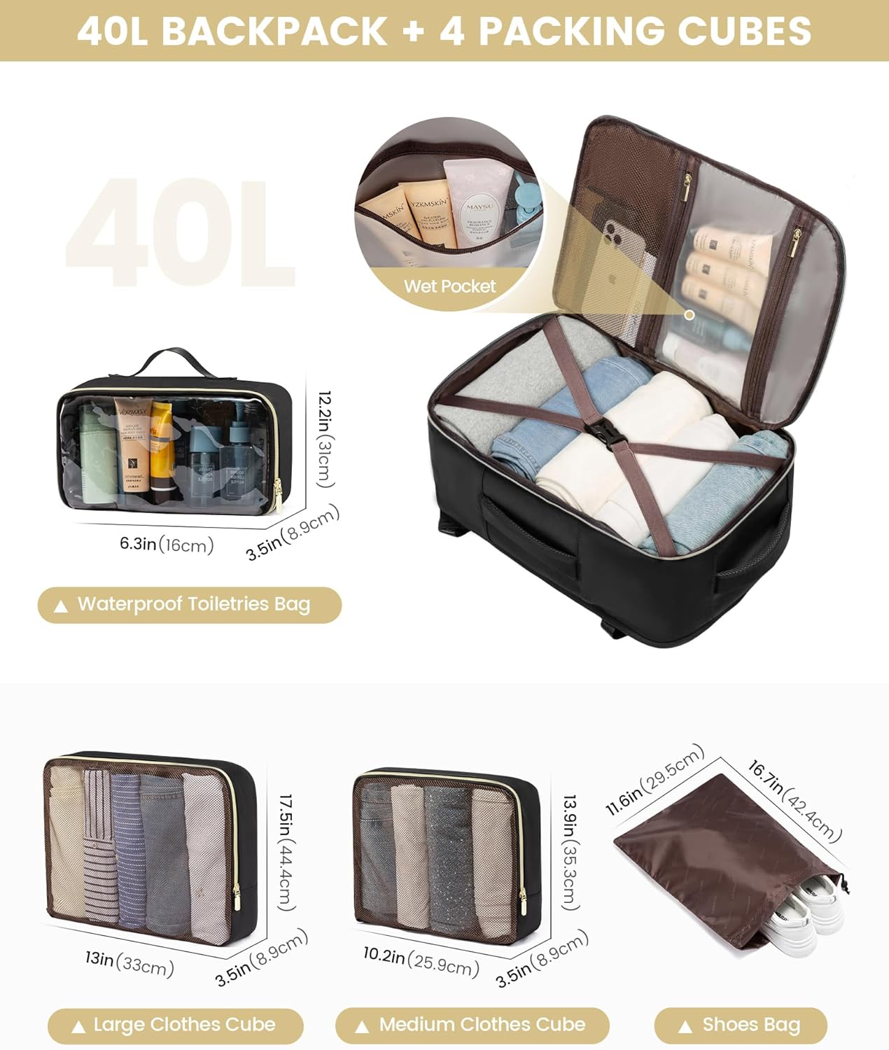 🍀4 Packing Cubes and Wet Pocket🍀 – Equipped with 4 extra packing cubes, including 2 clothes bags, 1 waterproof toiletries bag and 1 shoe bag. It also has a water-resistant wet pocket to keep dry and wet items separate, protecting other items from leaks or moisture. If you have wet clothes or towel, just put it in this Weekender Overnight Daypack.