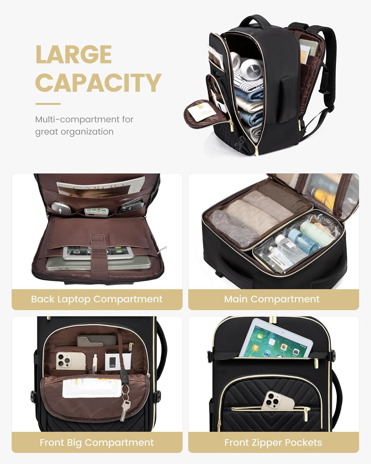 LOVEVOOK Large Travel Backpack for Women, TSA Carry on Backpack for Airplanes, 40L Personal Item Travel Bag fits 17″ Laptop, Waterproof Carry on Bag Flight Approved with 4 Packing Cubes, Black