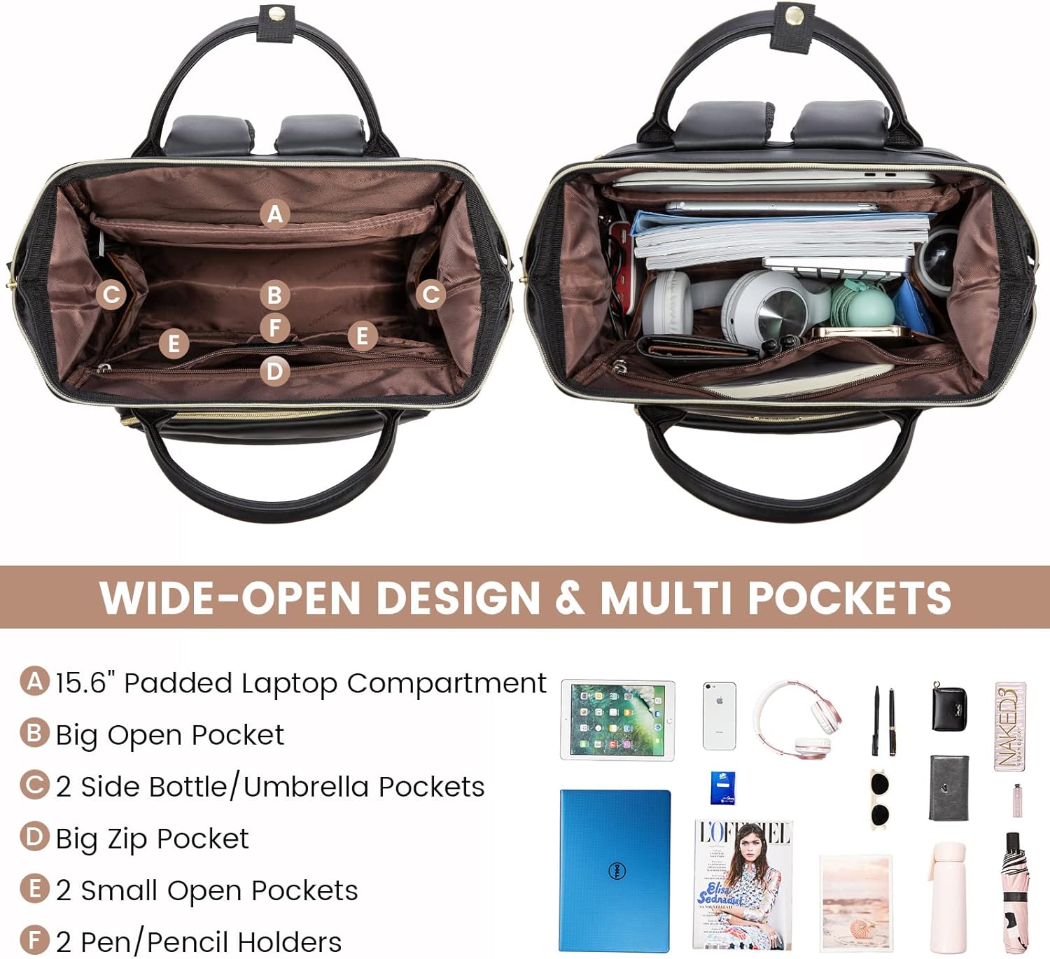 LOVEVOOK Leather Laptop Backpack for Women 17 inch,Travel Backpack Purse Nurse Teacher Backpack Computer Laptop Bag,Professional College Business Work Bags Carry On Backpack with USB Port,Black