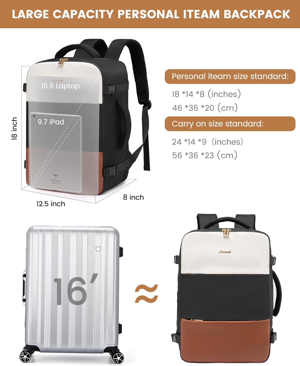 【AIRLINE APPROVED & TSA FRIENDLY】:Dimensions 18*12.5*8 inch, Light Weight 2.6 lb, Capacity 35L,our carry on backpack meets the requirements of airlines like Spirit, Frontier, and JetBlue. It fits under seats and in overhead compartments, with a 180° opening laptop compartment for quick security checks.