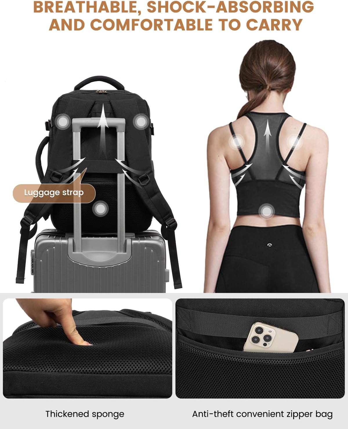 【ROOMY CAPACITY & MULTIPLE POCKETS】: Ideal for 3-5 day trips, this travel backpack for women features 3 main compartments and 15 pockets. It includes a separate laptop compartment for a 15.6-inch laptop and a 9.7-inch iPad, plus dedicated space for pens, textbooks, wallet, clothes, shoes, and bottles.