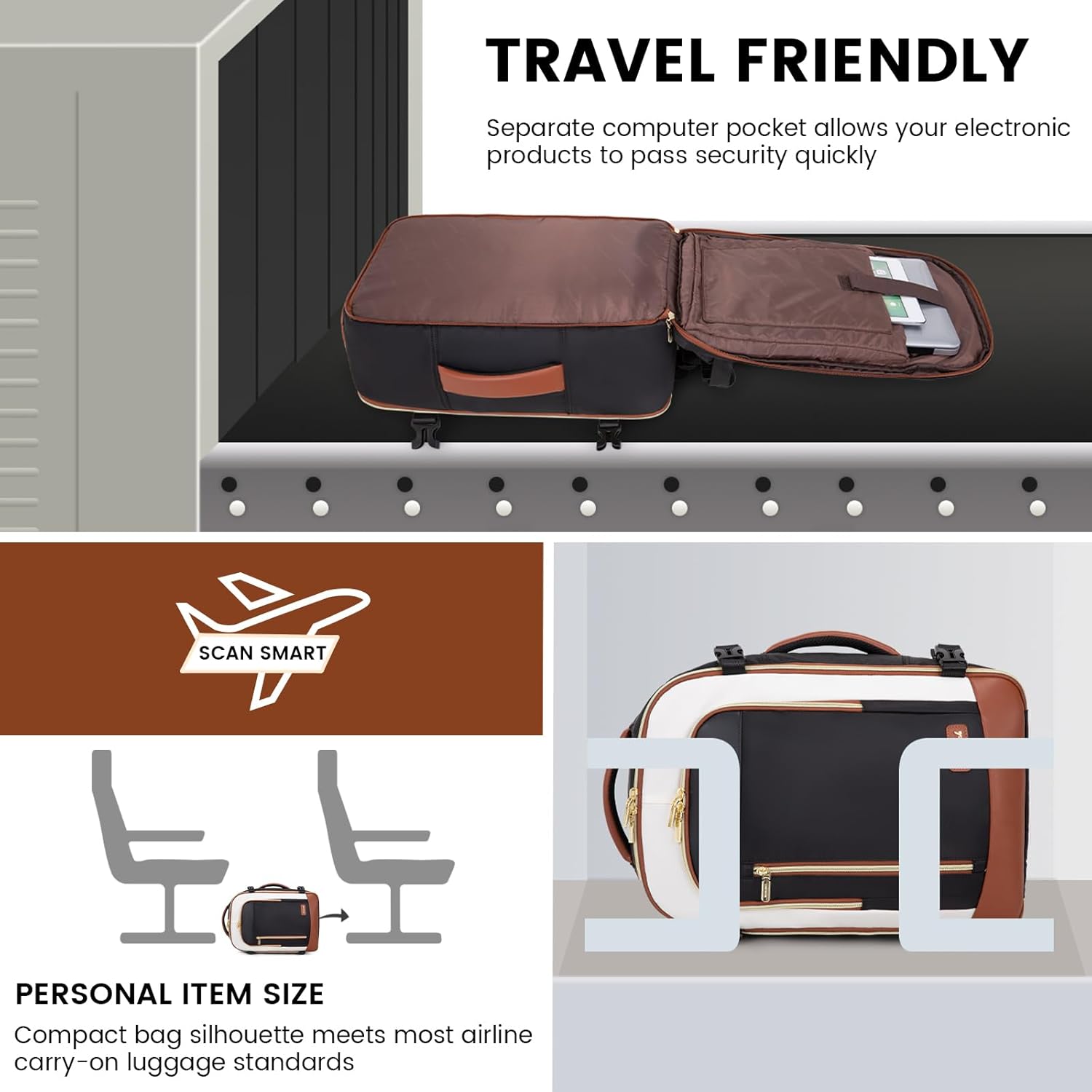 AIRLINE-FRIENDLY PERSONAL ITEM BAG: TSA-friendly personal item bag designed to meet most airlines’ size requirements. The separate laptop compartment opens 180 degrees, facilitating quick and easy security checks