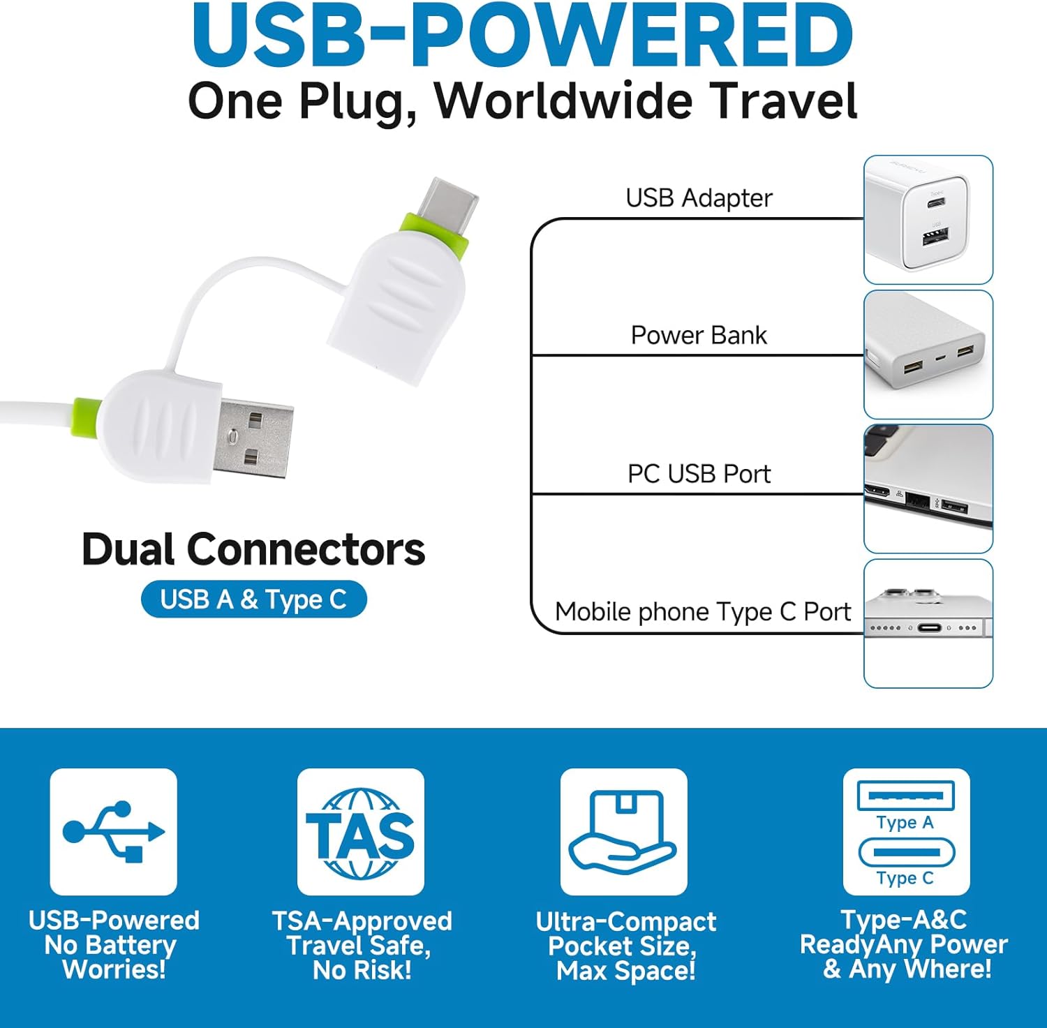 Dual USB Cable with Type-C & USB-A for Flexible Charging: Our vacuum pump comes with a built-in Type-C cable and an additional 1.2m USB-A/Type-C combo cord, giving you flexible charging options wherever you go. No batteries or special outlets required—travel smart and stay connected.