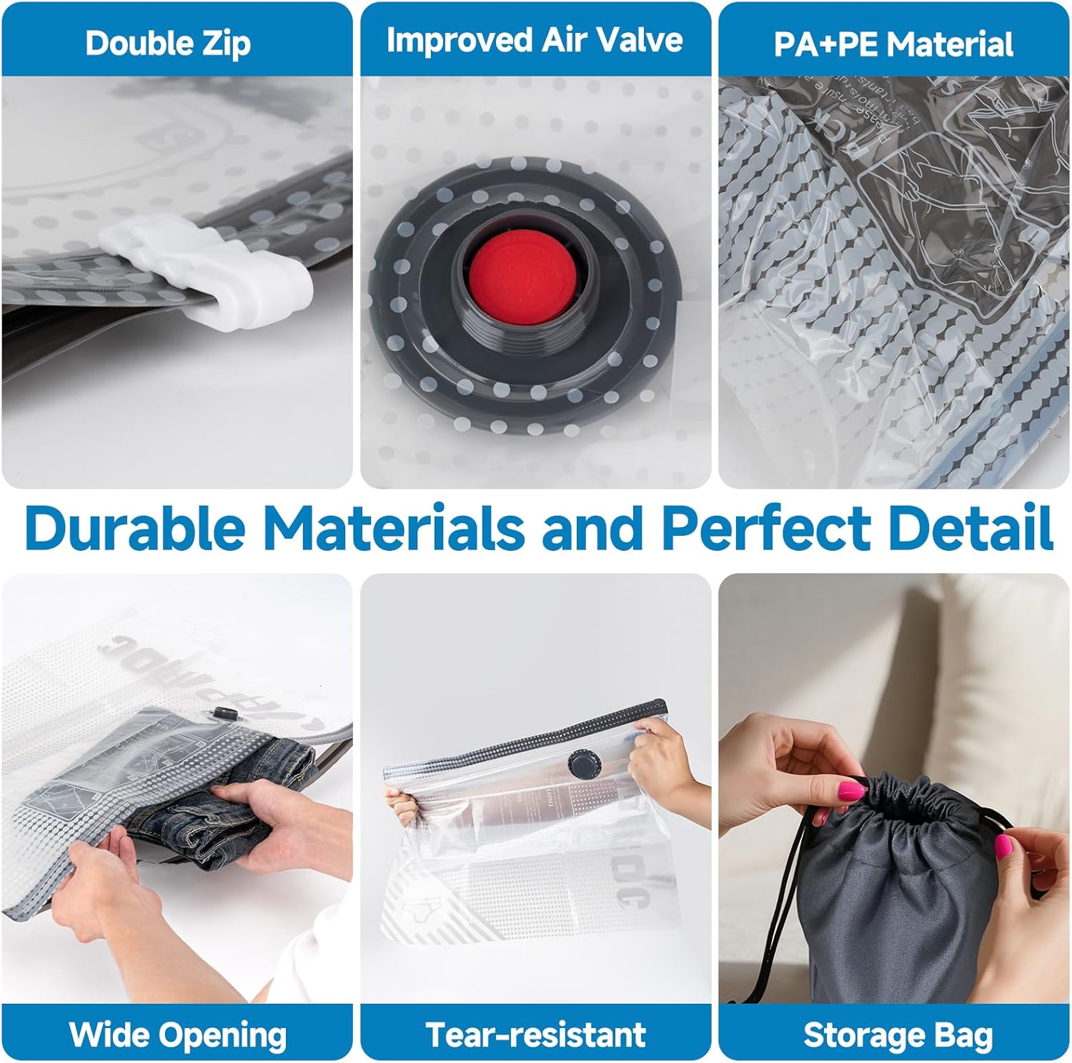 Durable, Airtight & Resealable PE+PA Bags: Each compression bag is made from premium thickened PA+PE material that resists tearing and moisture. Dual-seal zippers and upgraded long-side opening make sealing faster, while the semi-transparent design makes items easy to locate.