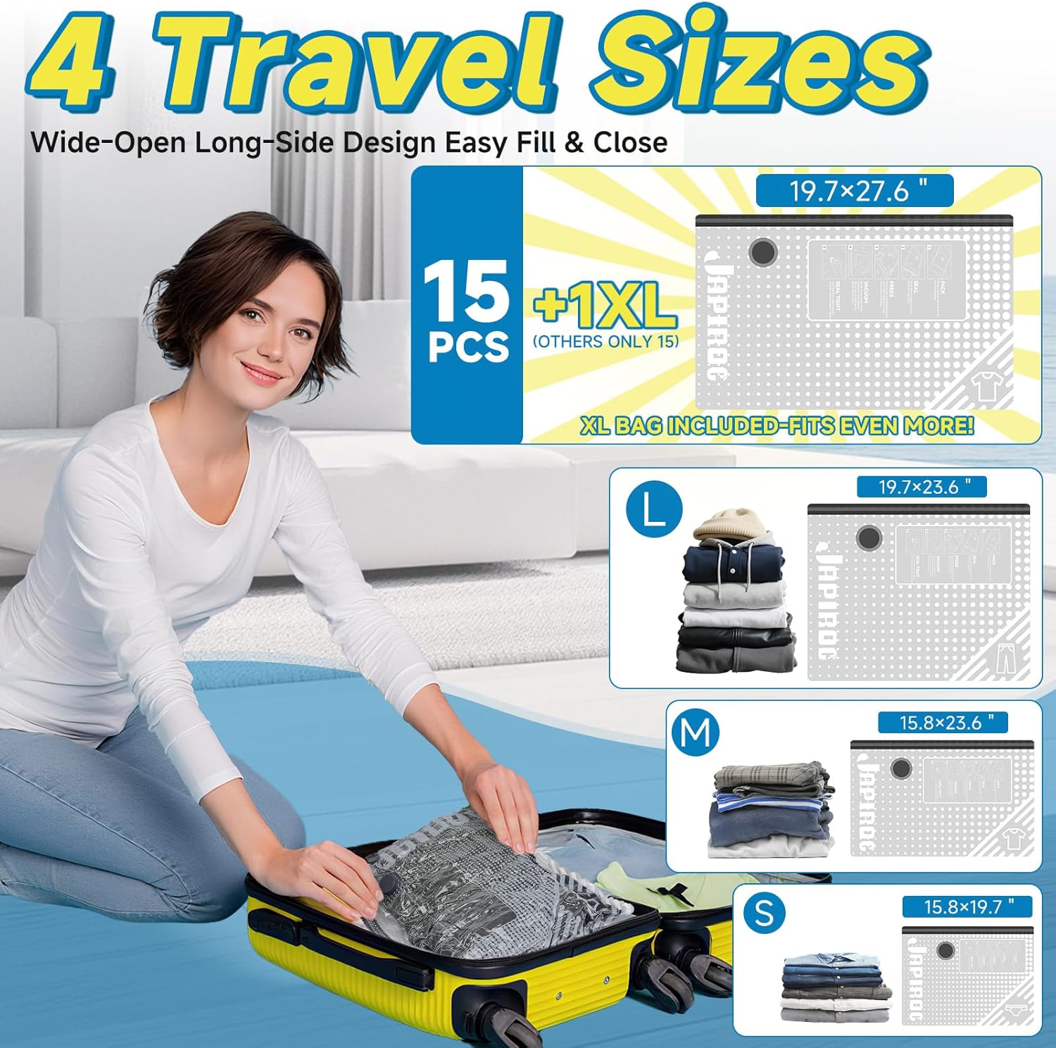 You’ll get 5 Small (15.8×19.7in), 5 Medium (15.8×23.6in), 5 Large (19.7×23.6in), and 1 Jumbo (19.7×27.6in) bags—ideal for clothing, jackets, or bedding.