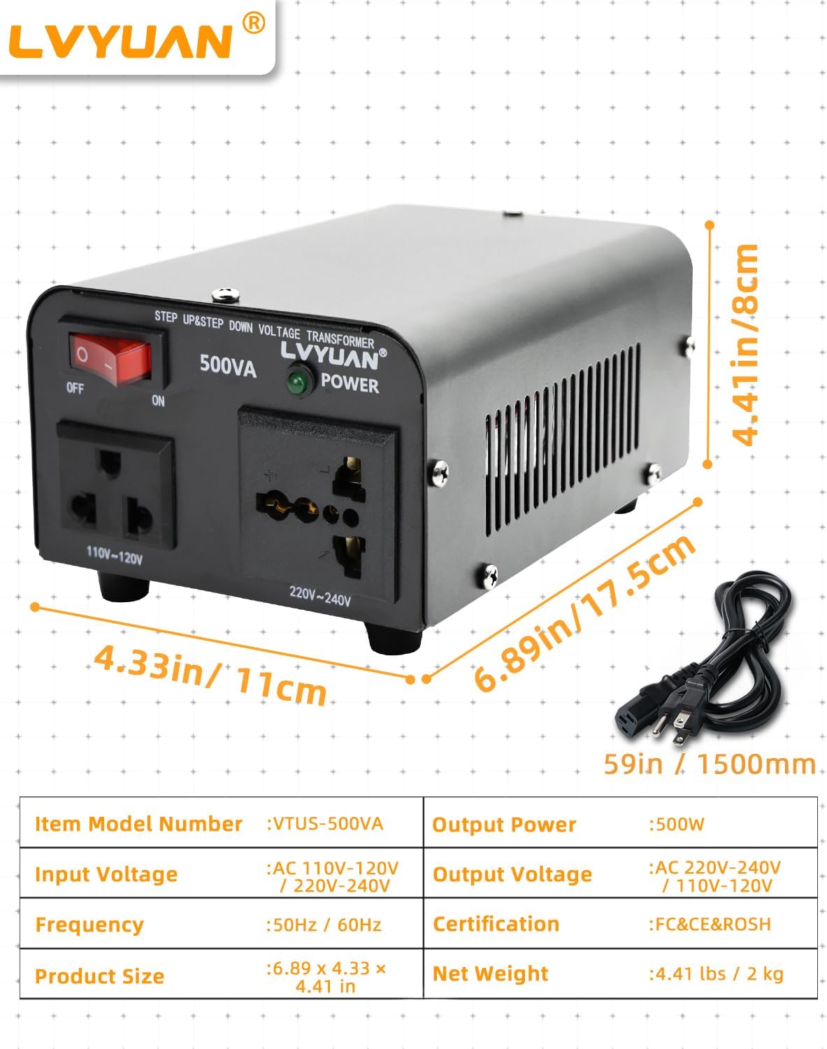 LVYUAN Voltage Transformer Converter 500 Watt Step Up/Down Convert from 110-120 Volt to 220-240 Volt and from 220-240 Volt to 110-120 Volt with US Outlet, Universal Outlet, Circuit Breaker