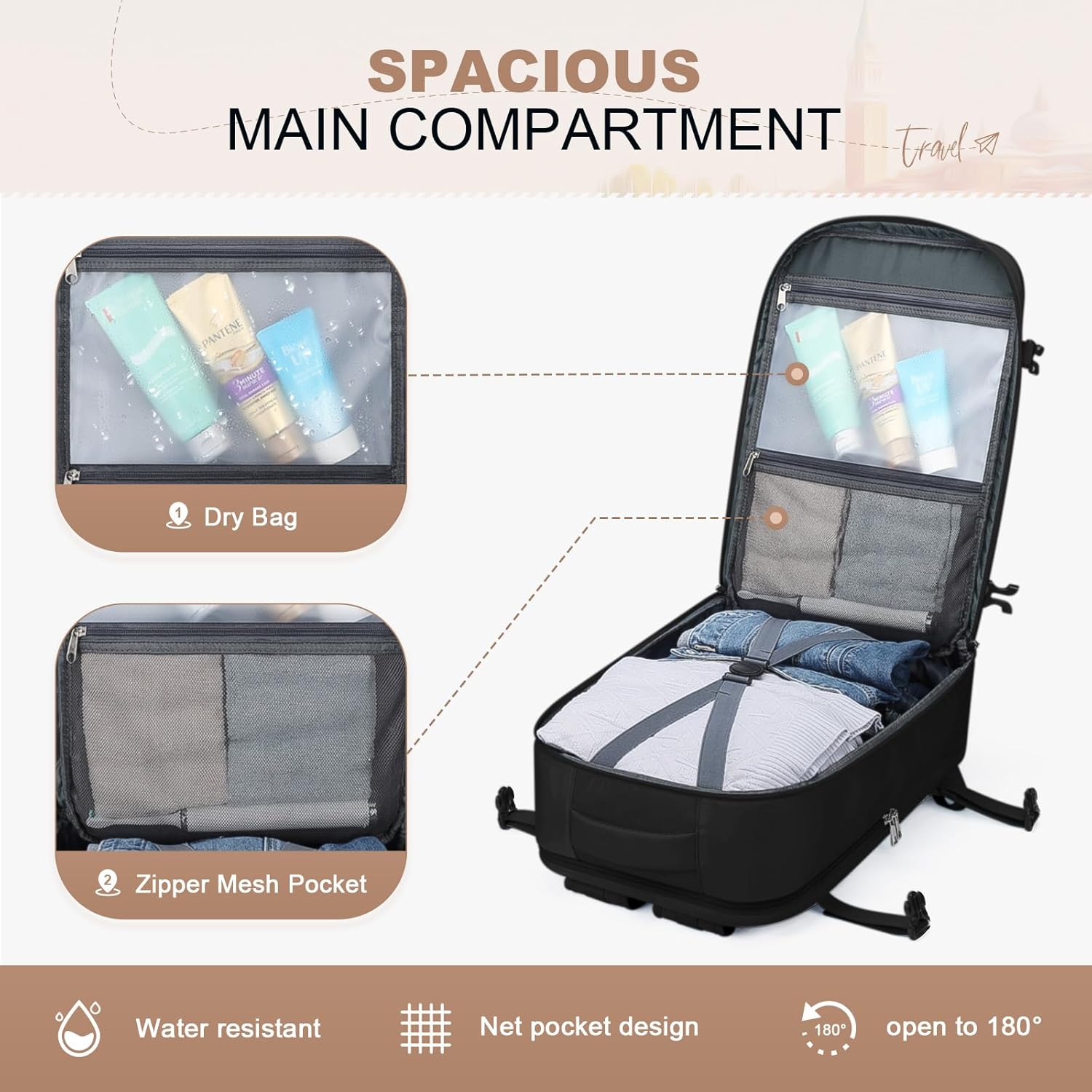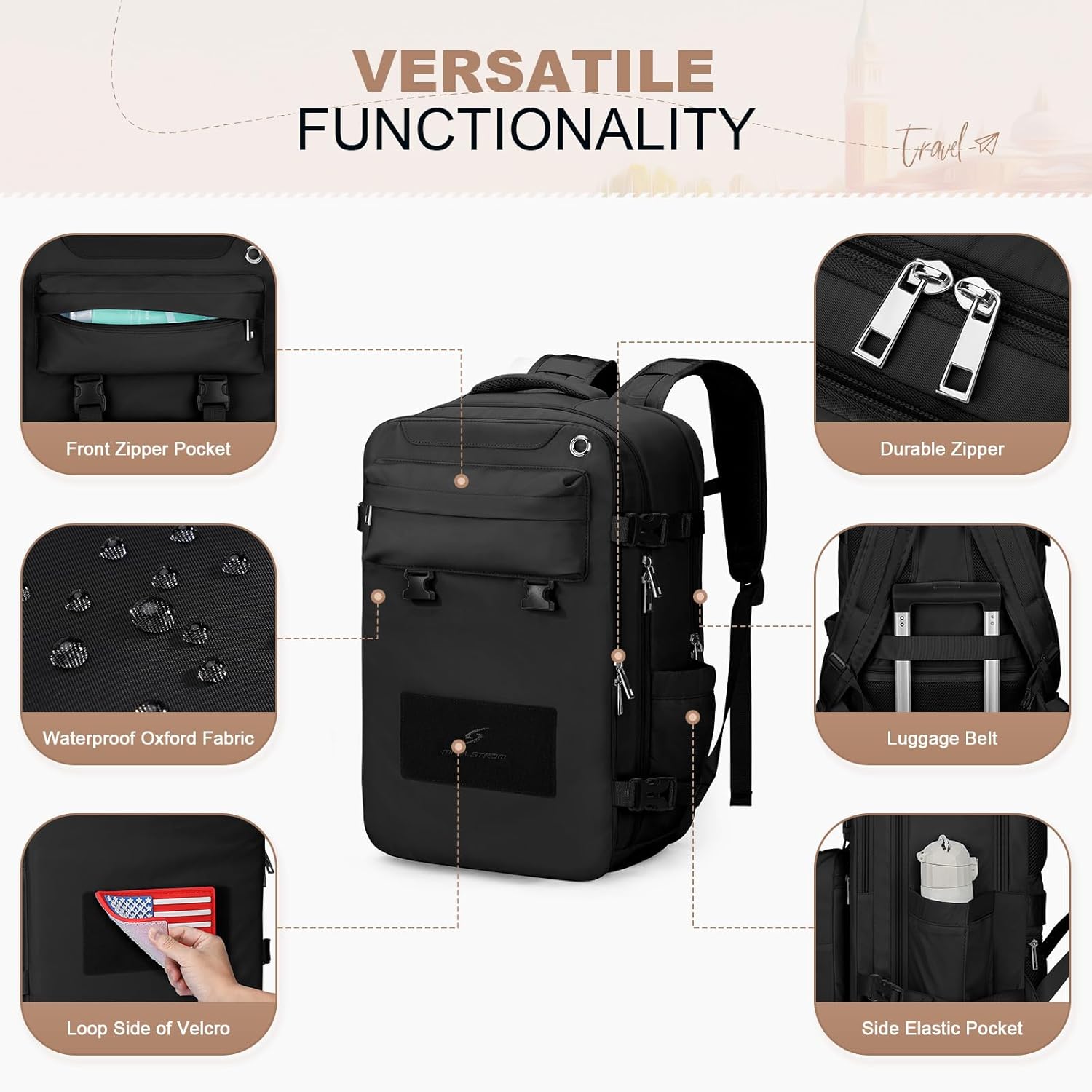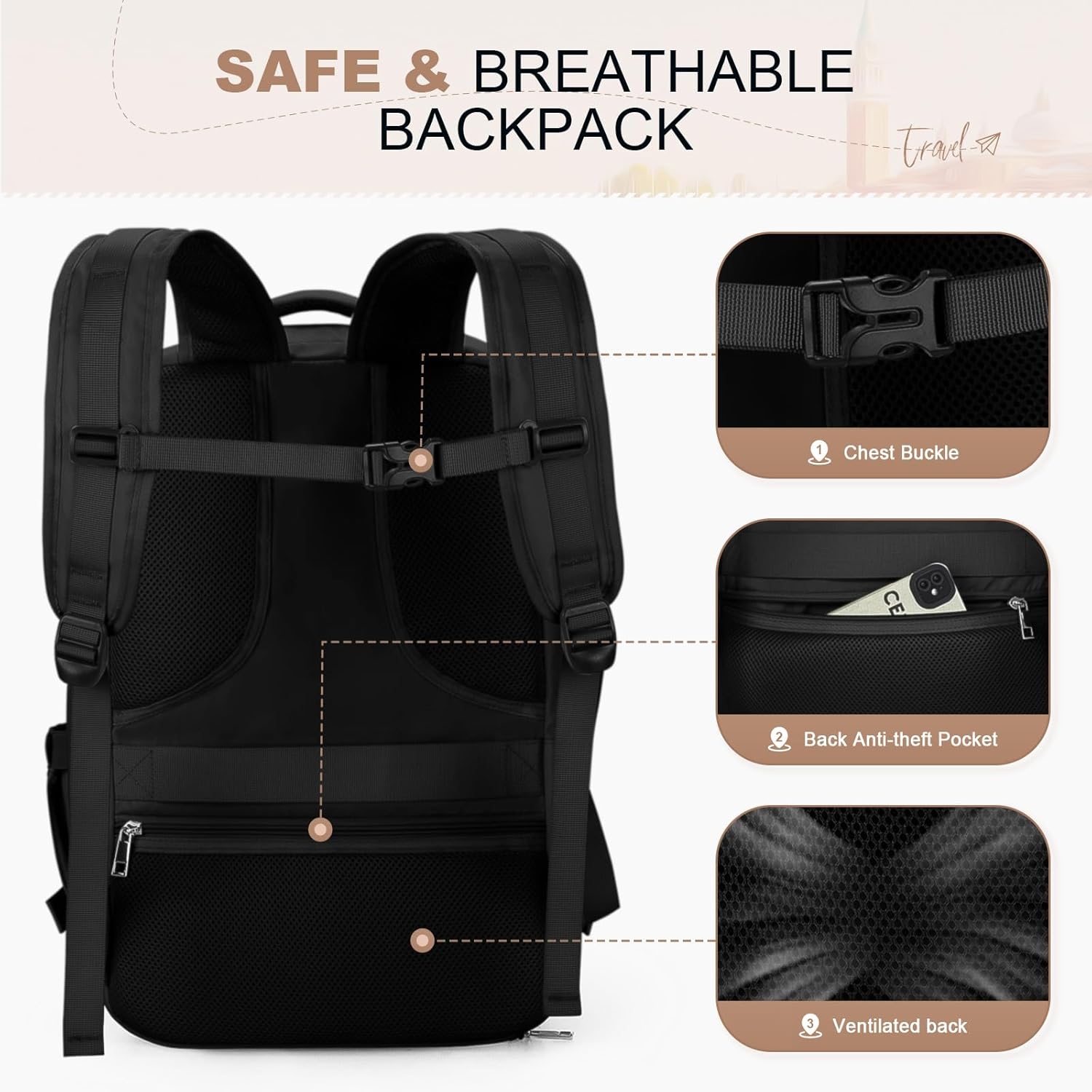 Airline Approved: Our carry on backpack for airplanes meets airline standards and fits perfectly both under the seat in front of you and in the overhead storage compartment, offering ample space to store all your travel essentials while ensuring it remains compact and lightweight for easy maneuverability.