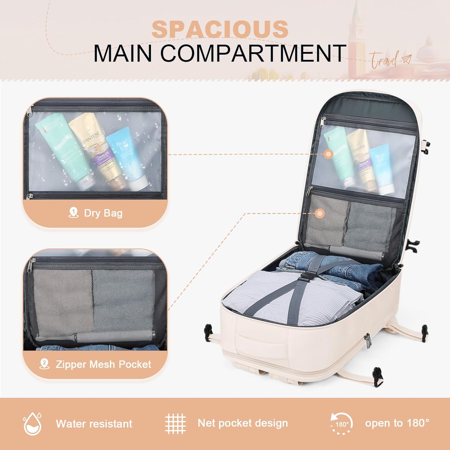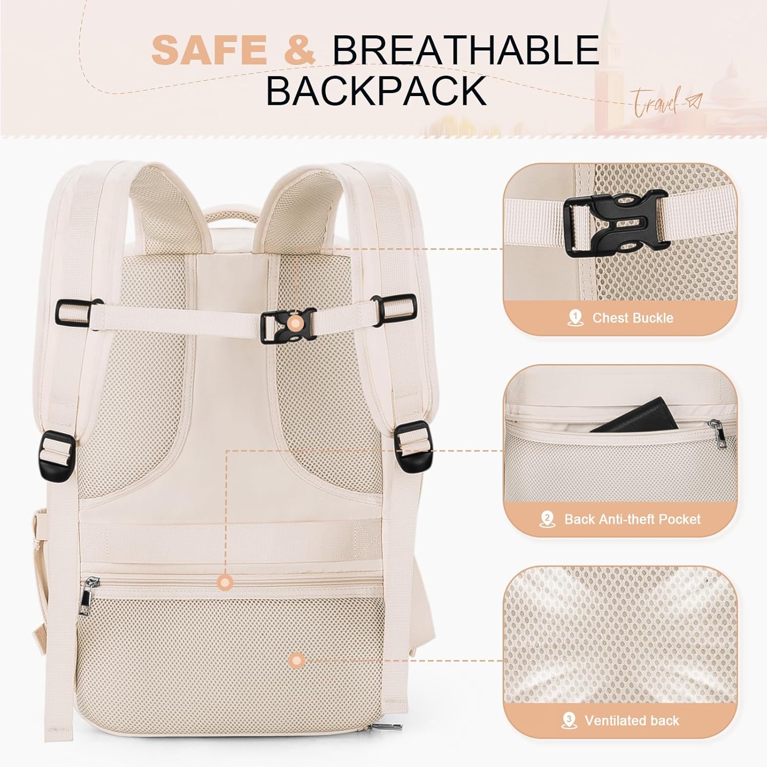 Convenient Travel Features: Enjoy hands-free transportation with the luggage belt that securely attaches the backpack to your carry-on luggage. This lightweight carry on backpack is designed for easy travel and also includes a back anti-theft pocket to keep your valuables safe and secure.The elasticated side pocket of this versatile backpack securely holds water bottles, umbrellas, and other travel essentials.