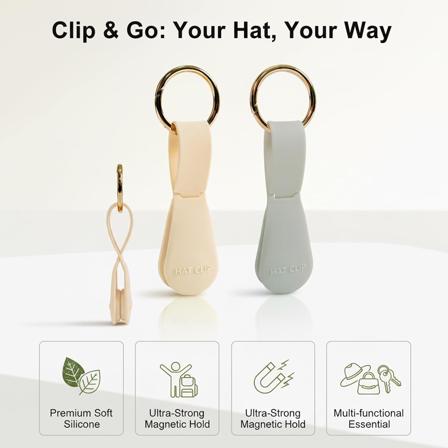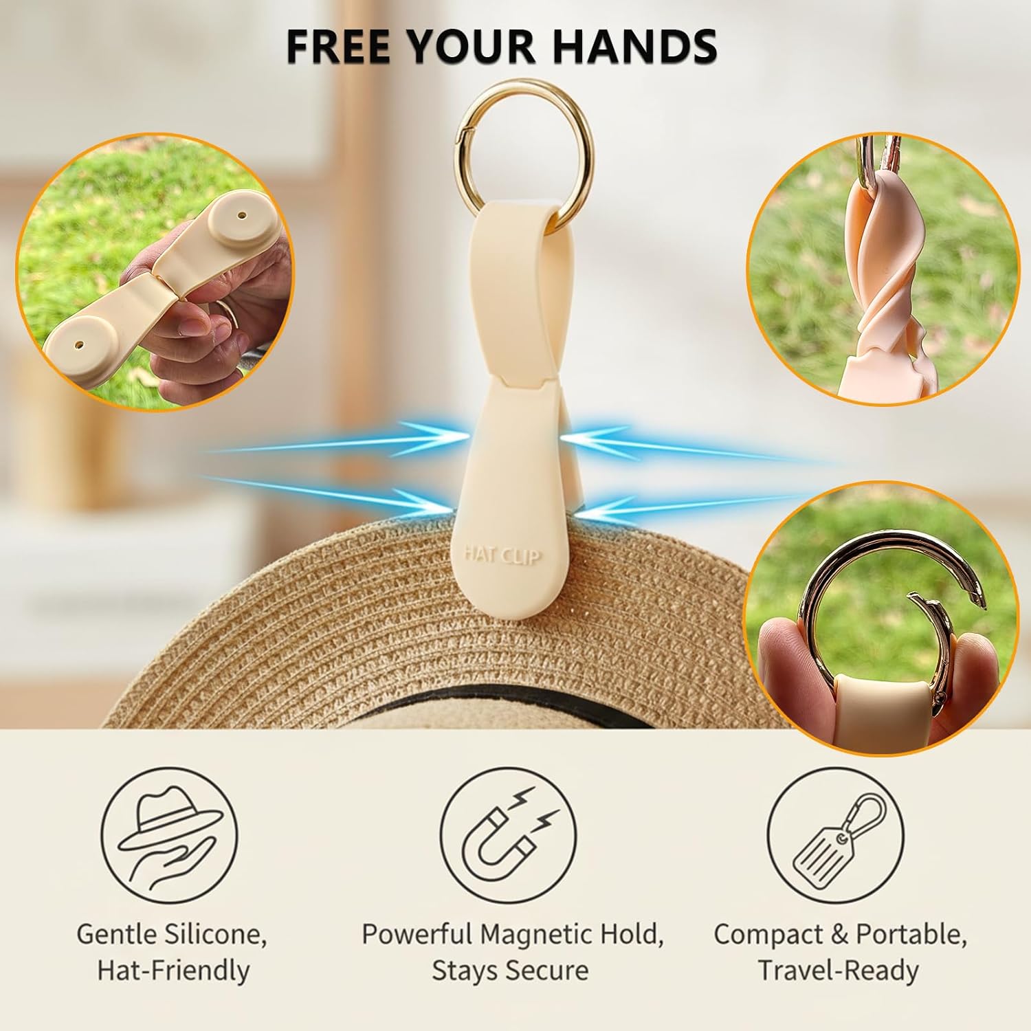 【Elegant & Secure Hat Clip for Women】Designed with style and function in mind, this magnetic hat clip is the perfect travel companion for women. It features a reliable locking mechanism and a sturdy metal carabiner that securely fastens to your purse, tote, or backpack, keeping your favorite hats safe and within reach.