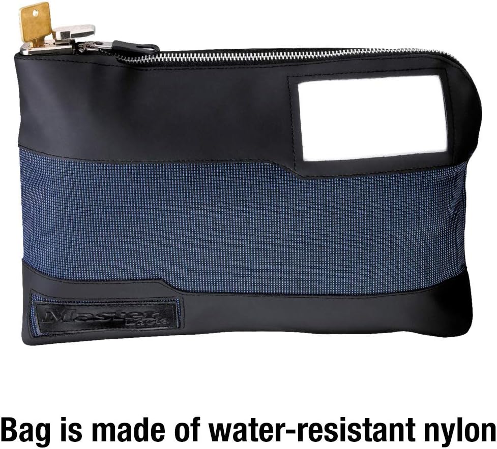 Bank bag is made of water-resistant nylon, protecting the interior contents from water damage; Reinforced seams providing long term durability