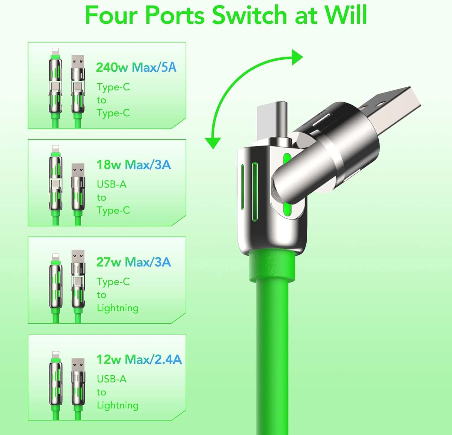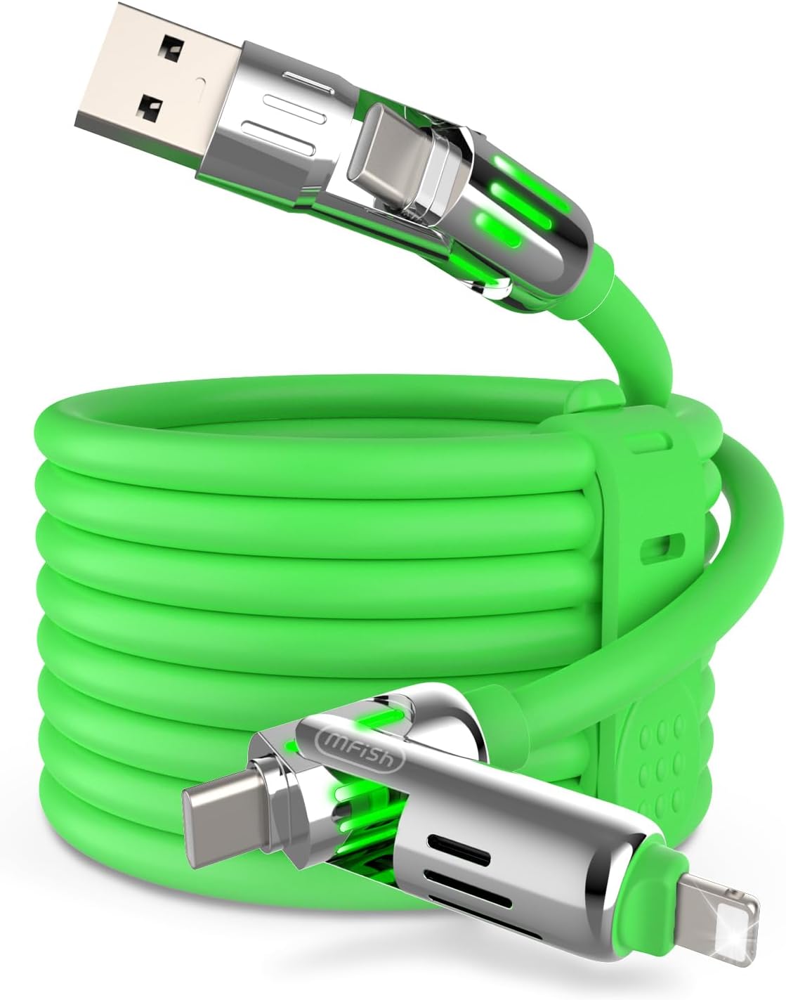 MFish 4-in-1 USB Charging Cable with Carrying Case, 240W Fast Charger Cord, USB-A & Dual USB-C to USB-C/Lightning, for iPhone 17/16/15/14, iPad, MacBook & More (Green, 6.6Ft)