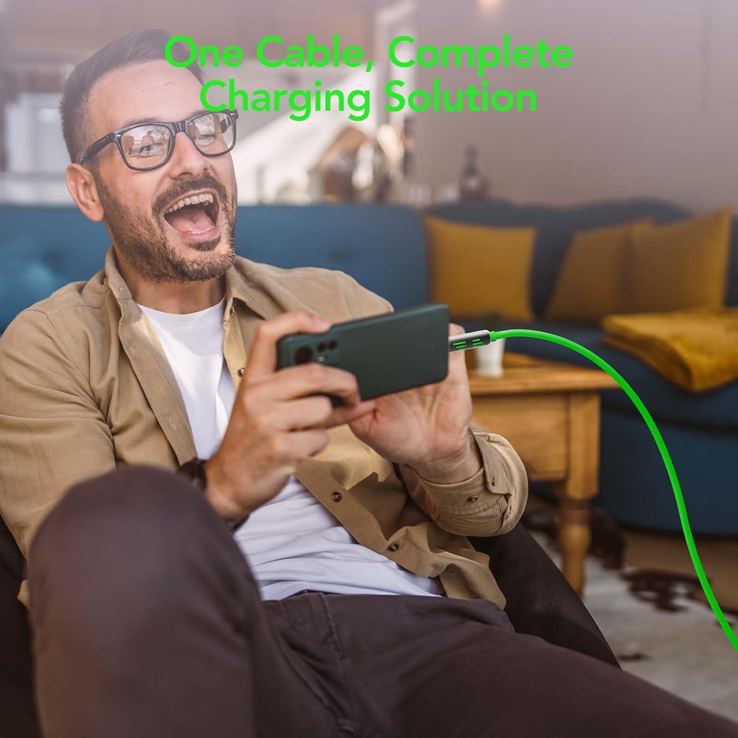 All-in-One Charging Solution – 4-in-1 design with USB-C to USB-C, USB-C to Lightning, USB-A to USB-C, and USB-A to Lightning. Charge phones, tablets, laptops, and more with a single cable.