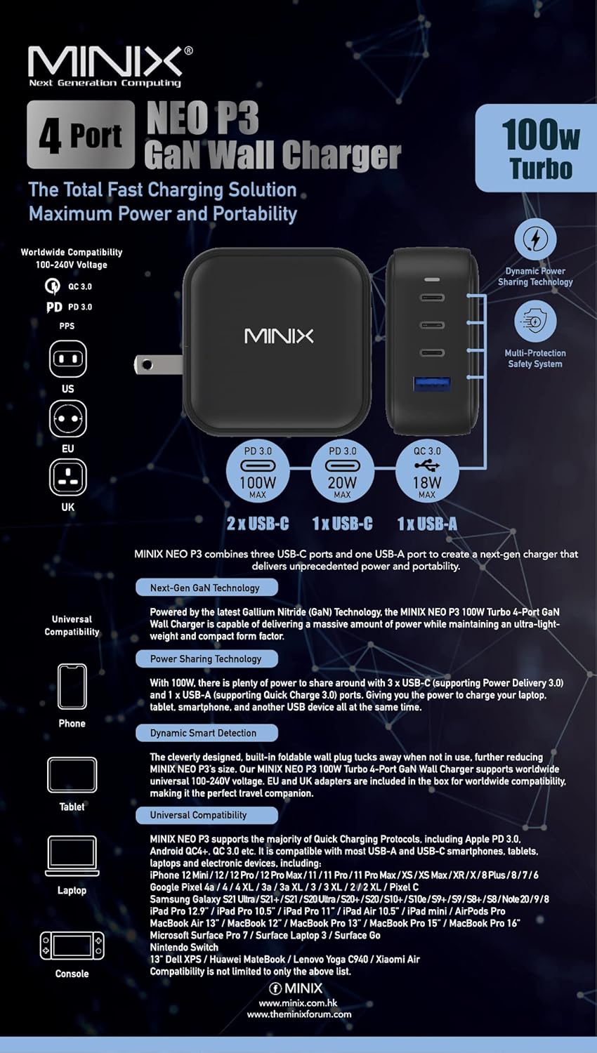 【Turbo 4-Port Fast Charging GaN Charger】Powered by the latest Gallium Nitride (GaN) Technology, MINIX’s 100W 4-Port GaN Charger delivers fast charging speeds in a smaller form factor design compared to traditional silicon-based chargers