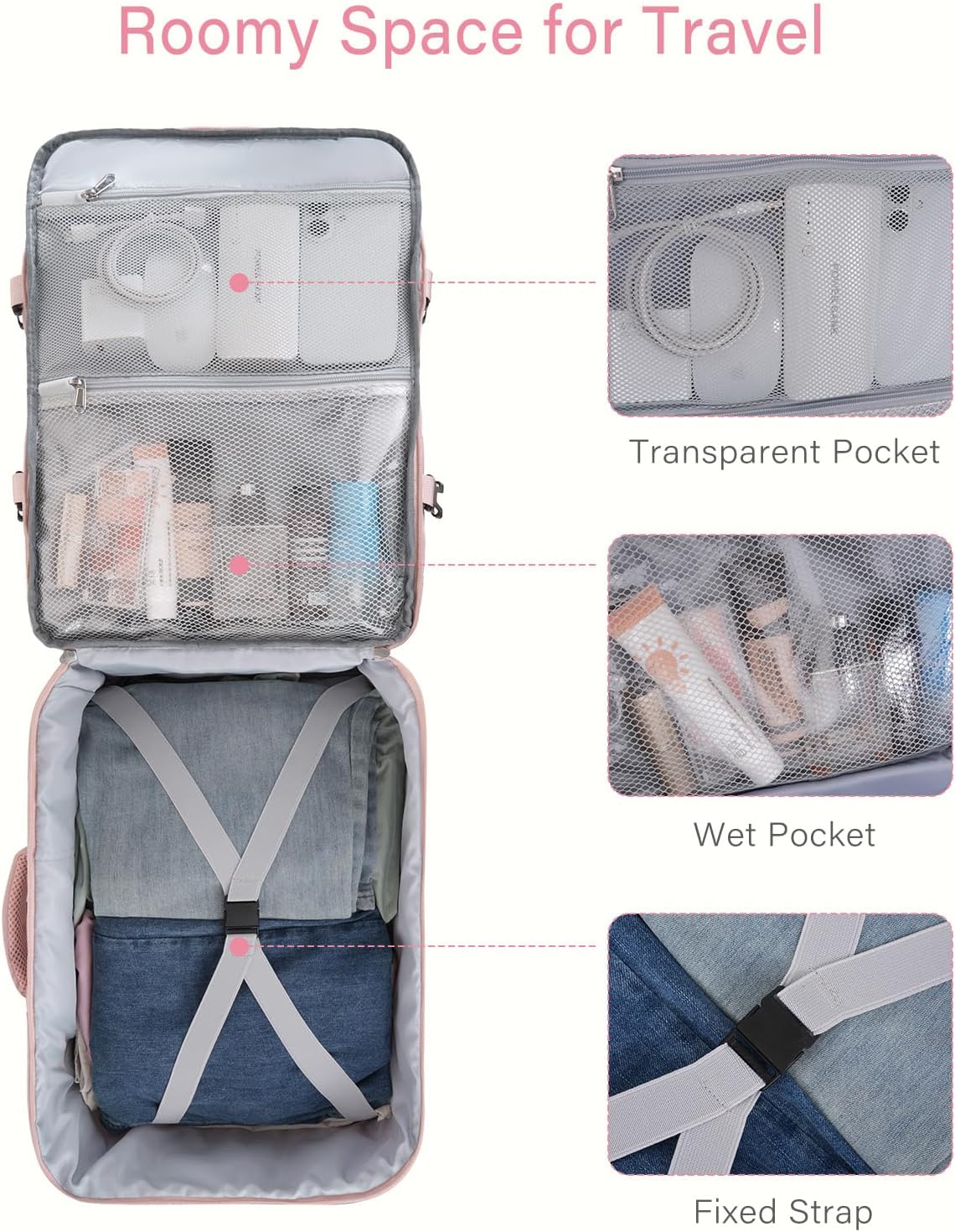Dimension: 18.11 x 12.61x 7.9 inches (L x W x H). This travel backpack meets the requirements of airlines, it can easily fit under the seat or in the overhead compartment, saving time for checked luggage, it is the best personal item for air travel.