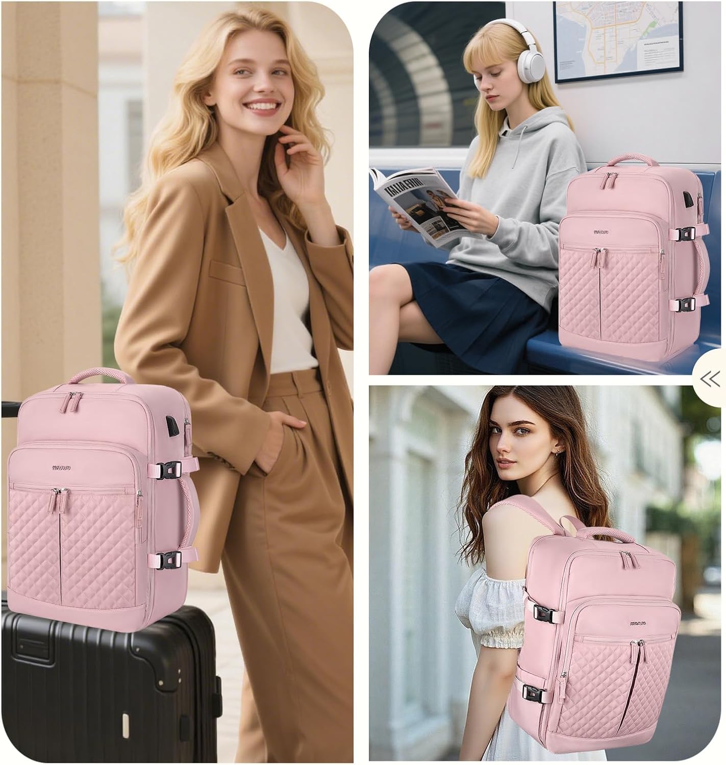 MOSISO 40L Travel Backpack for Women, Rhombus Quilted Flight Approved Carry on Daypack with USB Charging Port&Drawstring Bag, 17-17.3 inch Laptop Backpack for Office Work Travel Essentials, Pink