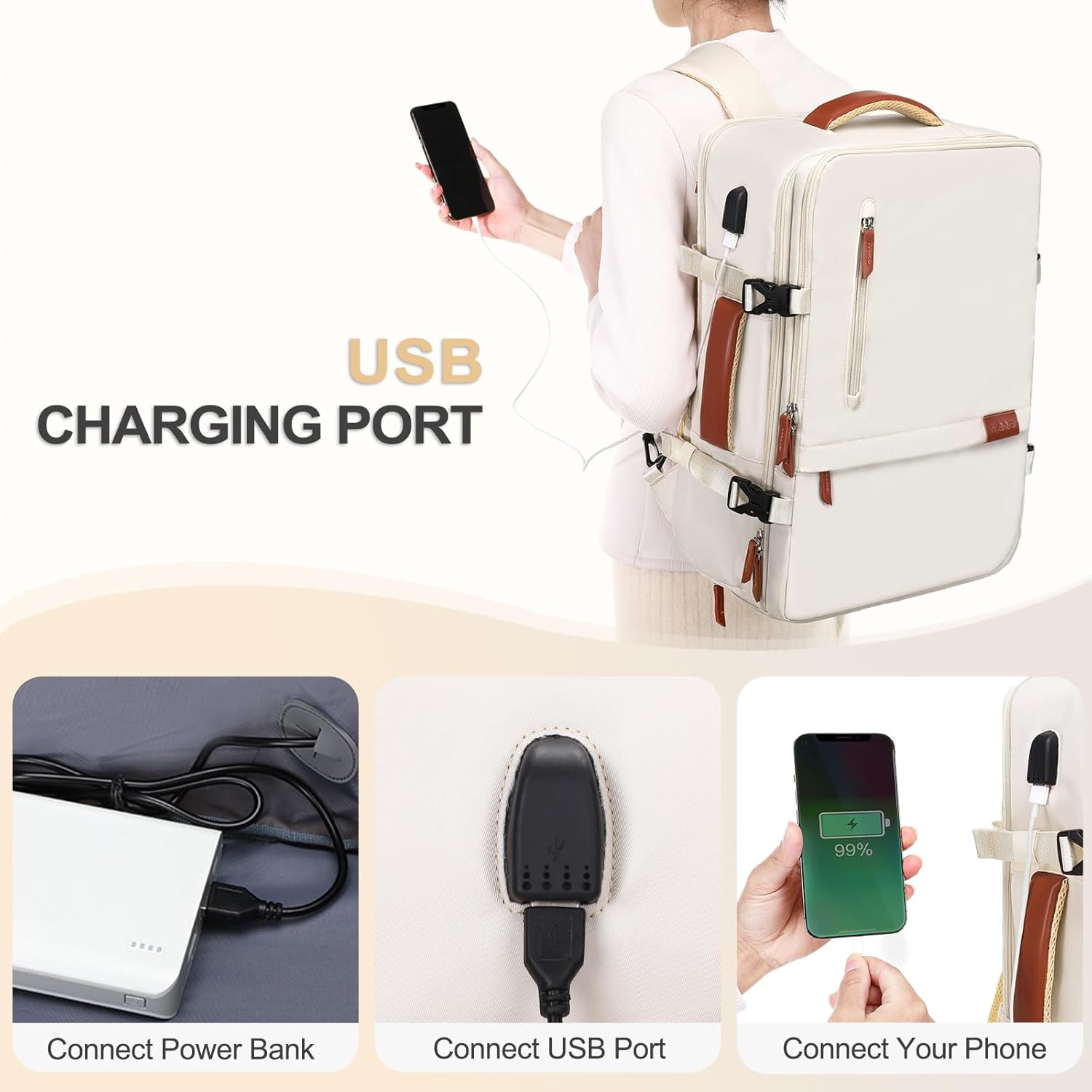 With Luggage Belt & USB Charging Port: Back luggage strap allows backpack to slide over the luggage tube, secure your backpack in place, provides a convenient way to carry the backpack and release your shoulder. With built in USB charging port outside and built in charging cable inside, this backpack offers you a convenient way to charge your phone while walking. Please noted that this backpack doesn’t power itself, usb charging port only offers an easy access to charging device.
