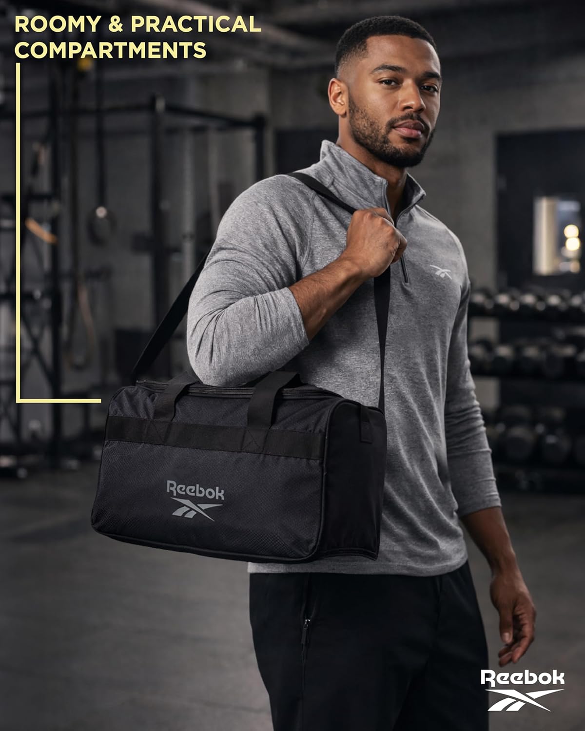 Reebok Duffle Bag – Carry On Gym Bag for Workout and Compact Travel Bag – Small Size Overnight Bags for Women and Men, Size Small, Warrior II Black with Grey Logo