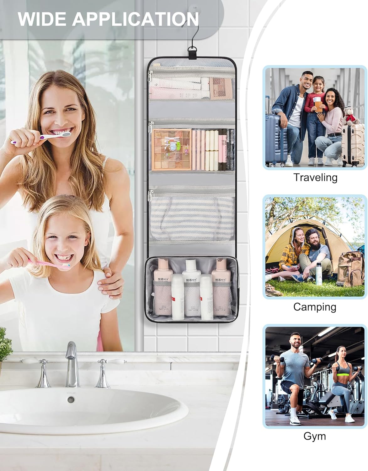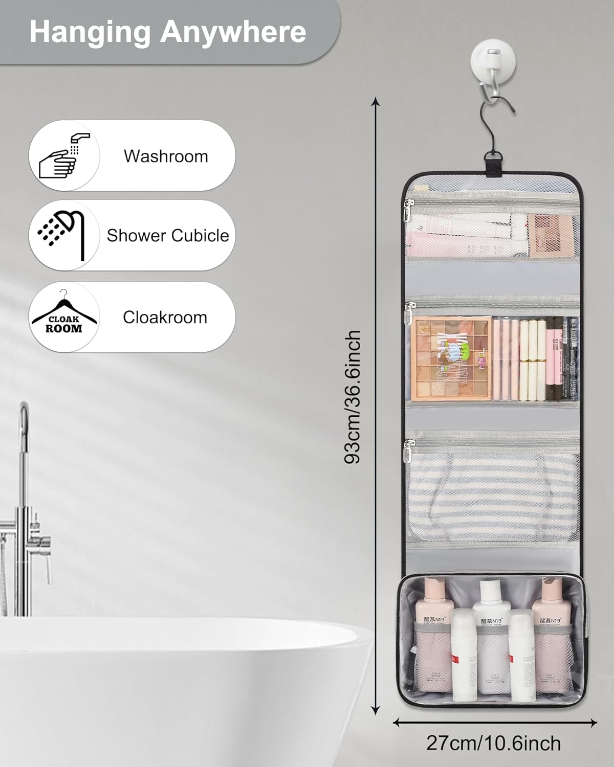 【LARGE CAPACITY TOILETRY BAG】Foldable size with 10.6 x 8.5 x 2.4 inch, Open size with 10.6 x 32.5 inch (not include the hook). 4 separate compartments with zipper, suitable for travel to pack all men, women and kids toiletries.