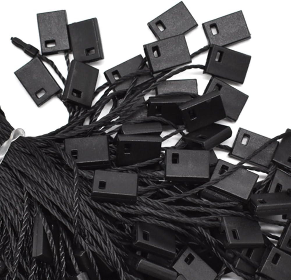 Package Specifications 1000pcs hang strings Black Nylon & plastic material 7 inch long Plastic locker: 0.3″ (W)* 0.4″ (L) Reusable