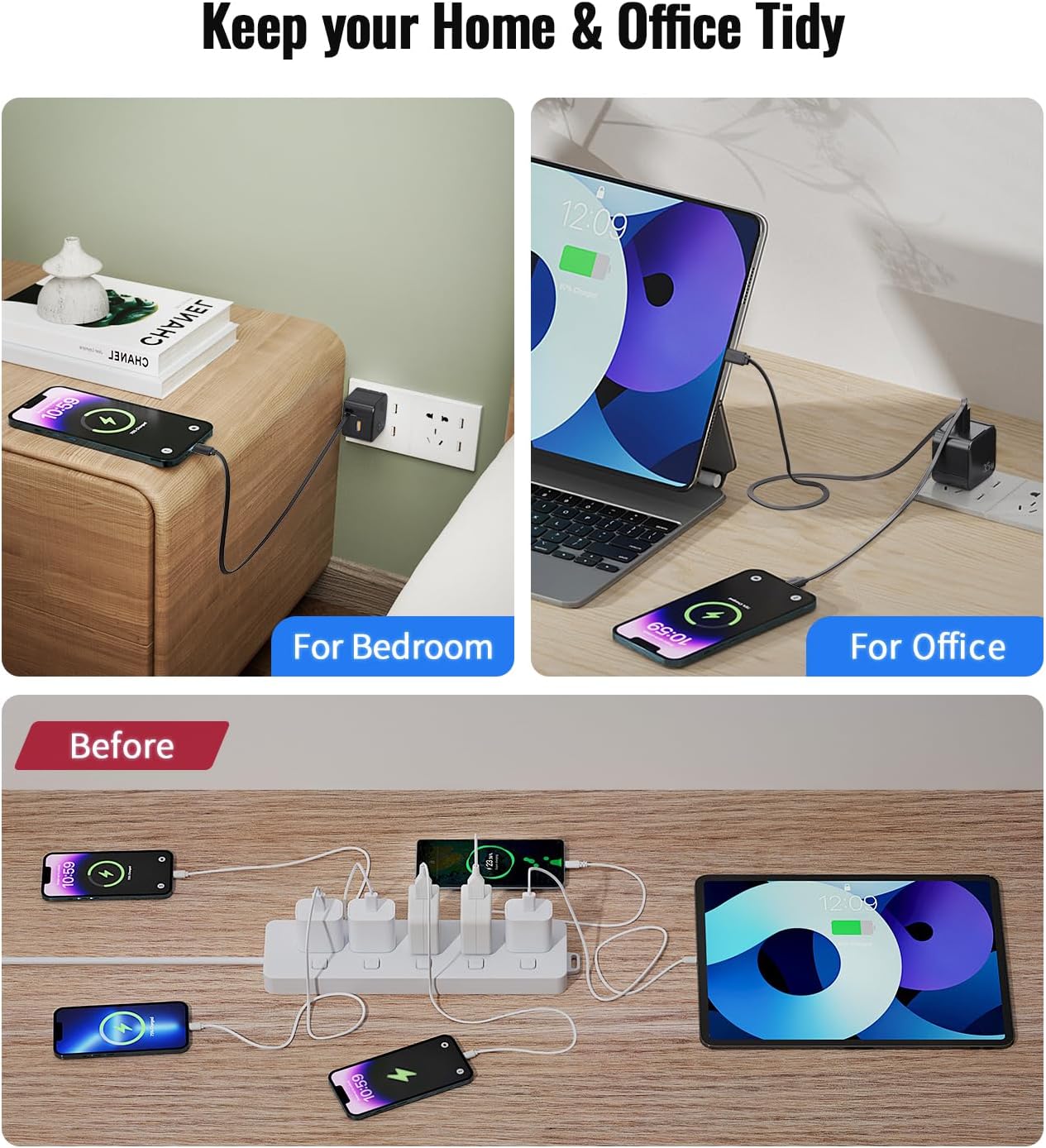 [Easy to carry and use] The retractable wall charger for iphone is foldable and smaller than the traditional charger,it can save more space and convenient to use. Perfect for travel, bedroom storage, kitchen safe charging, office working.