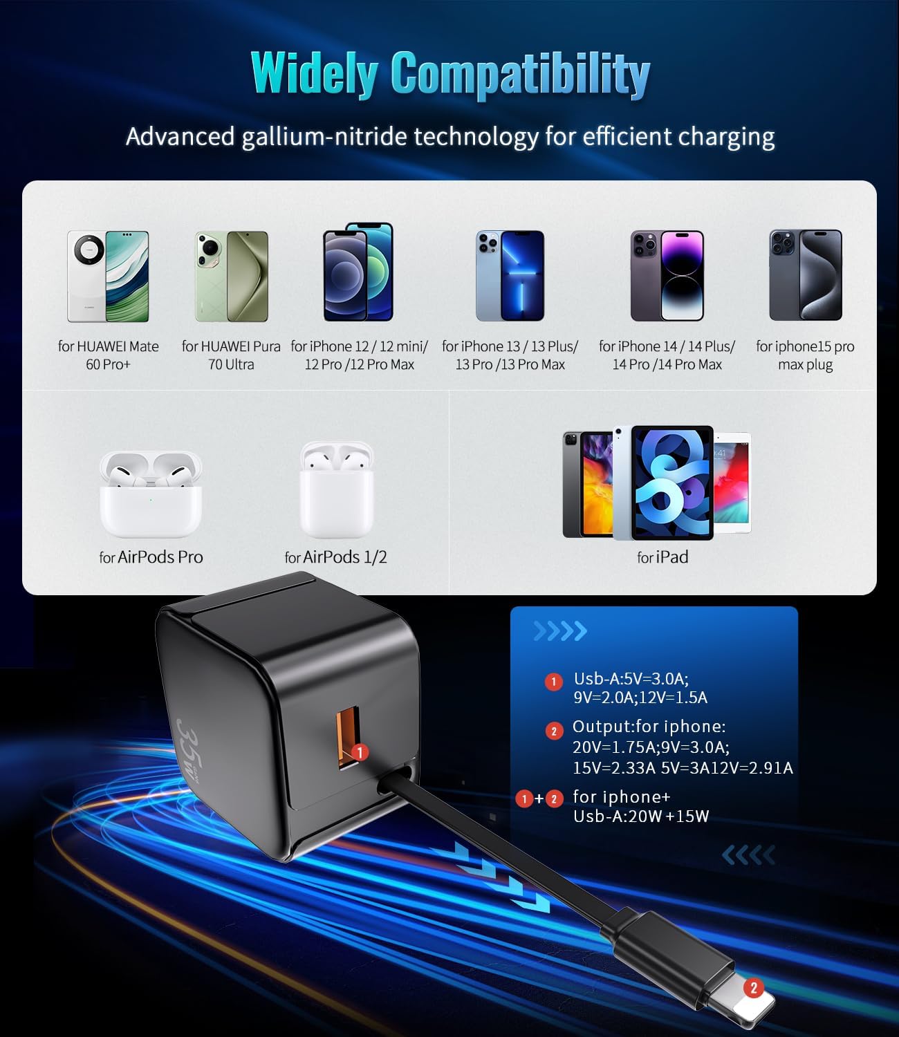 [Dual Fast Charging Port] The PD 35W portable wall charger can fast charge your two devices simultaneously. Only charge one device,max support 35W or USB A is 18W. When charge two devices simultaneously, max supports PD 20W + USB A 15W. USB-A Port: For iPhone 16/15/14/13/12 Pro Max,Galaxy S24/S23/S22/S21/S20/S20+/ S20 Ultra,Note 10/10+/20 Ultra,Switch, Pixel ect. Retractable Cable: For iPhone 14/14 Plus/14 Pro/14 Pro Max/14 Mini,13/13 Plus/13 Pro/13 Pro Max/13 Mini/11 Pro Max ect.