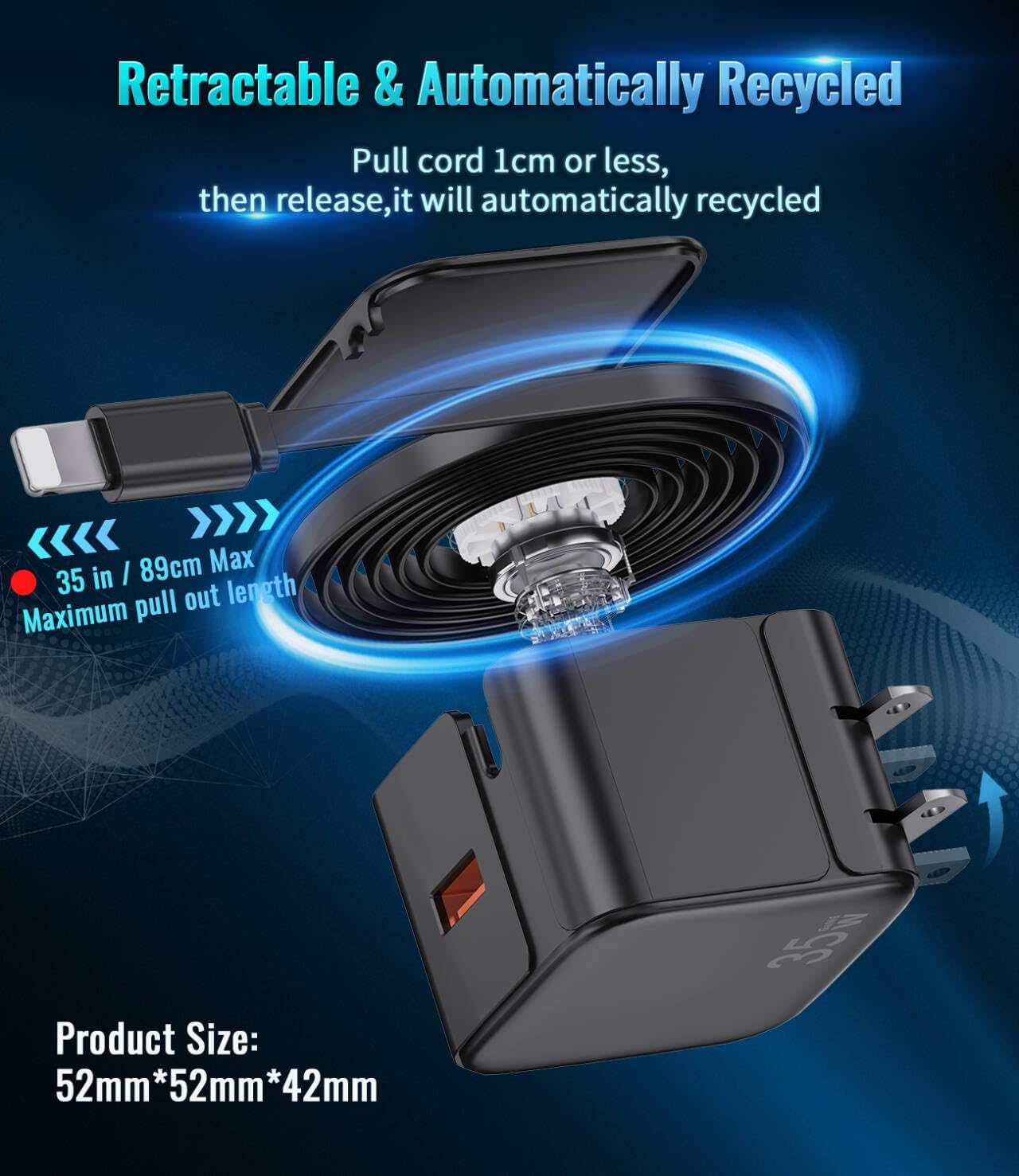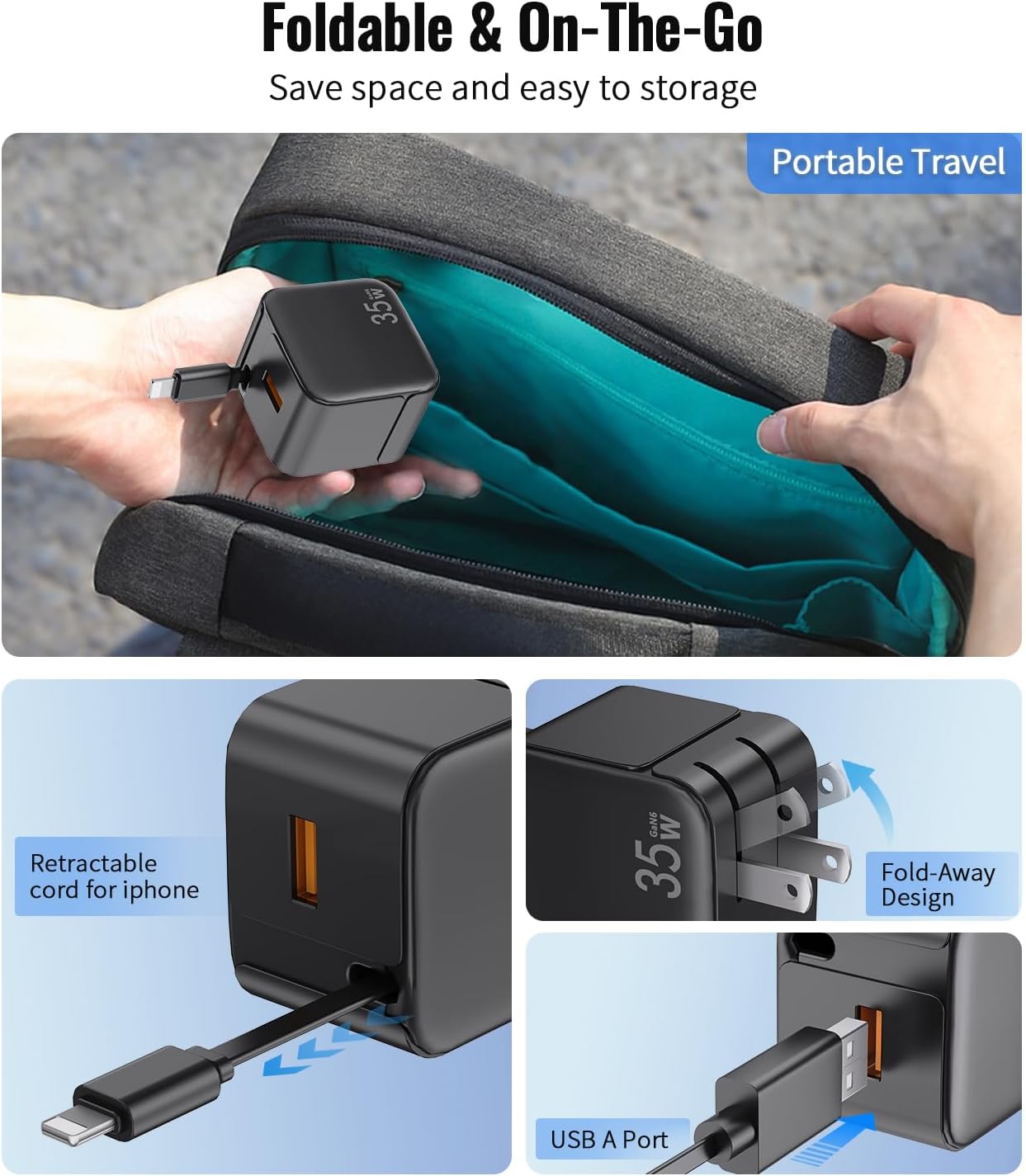[Revolutionary Gallium Nitride Technology] The retractable phone charger wall plug bulit-in advanced Gallium Nitride technology materials. One Port Charge MAX Up To 35W,More fast charging than other brand only 20w max. It can fast charge for iPhone 14 13 Pro Max from 15% to 65% in just 20 mins. Built-in overcharge, overcurrent, overvoltage other protection to ensuring efficient charging