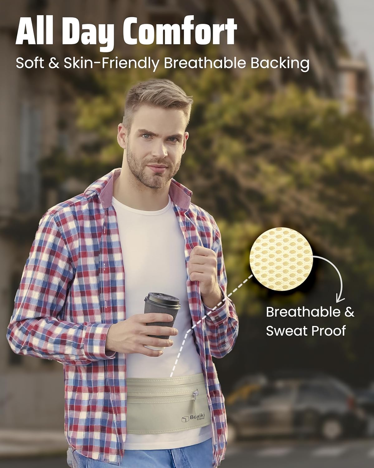 MAXIMUM COMFORT & BREATHABLE DESIGN – Say goodbye to discomfort! Our travel waist pouch features a soft, moisture-wicking mesh backing and an adjustable, reinforced elastic strap for a snug yet breathable fit. No sweating, itching, or irritation – just all-day comfort while you travel with this under clothes travel pouch.