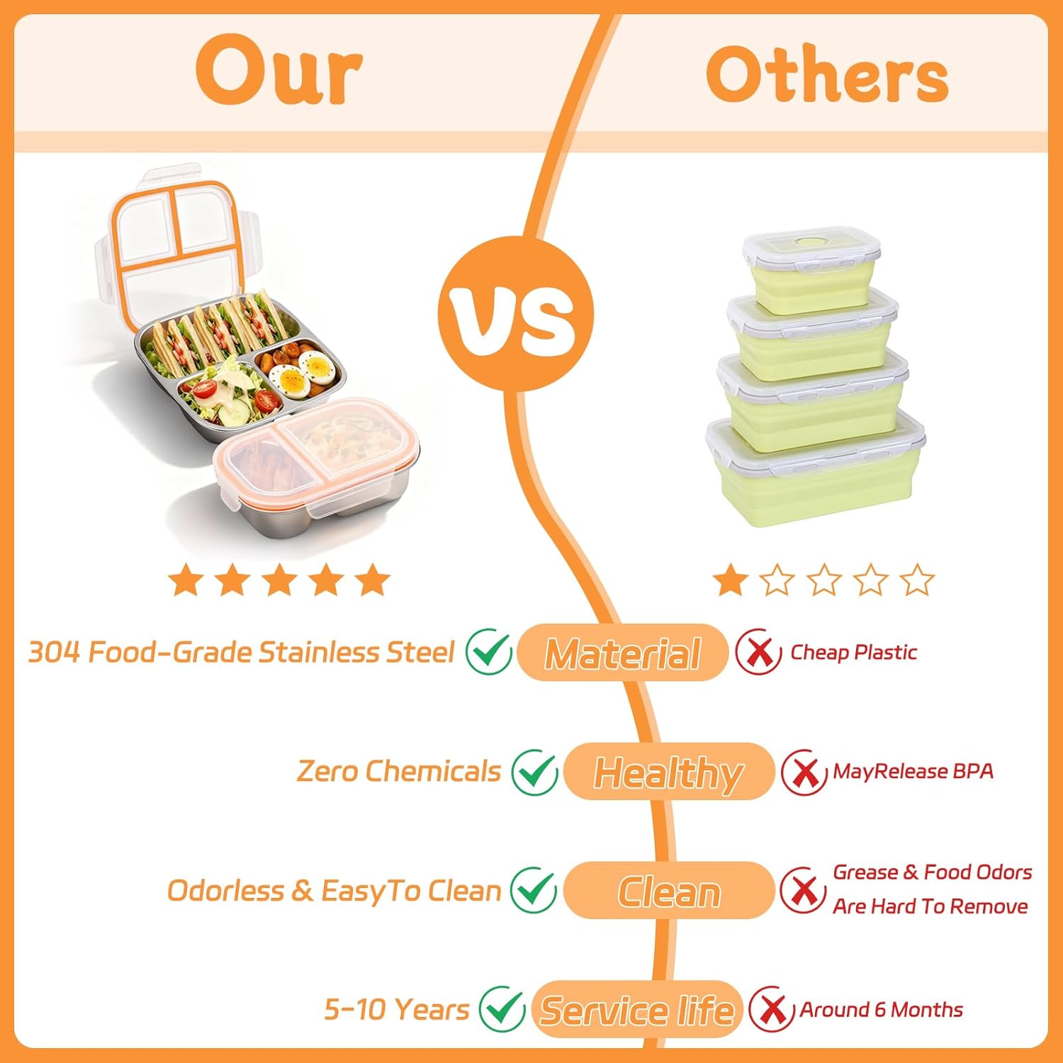 Safely & Reliable: Crafted from premium stainless steel food storage containers, these are from coatings and odors. They’re awesome as stainless steel lunch containers or daily snack containers for adults. Microwave and dishwasher safely (lid removed), making every meal prep simple.
