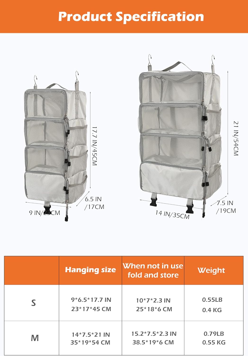 TABITORA Travel Luggage Organizer insert Hanging Packing Cubes for Suitcase Carry on Closet Hanging Shelves Folding(Grey,M)
