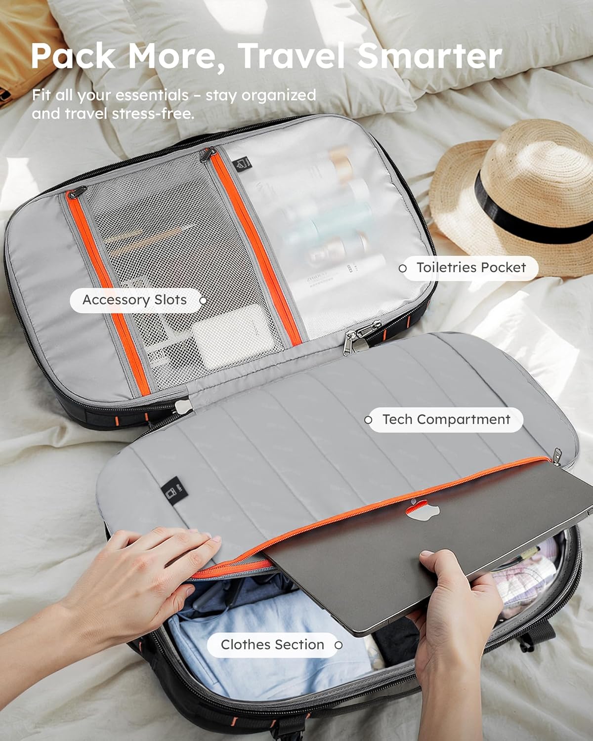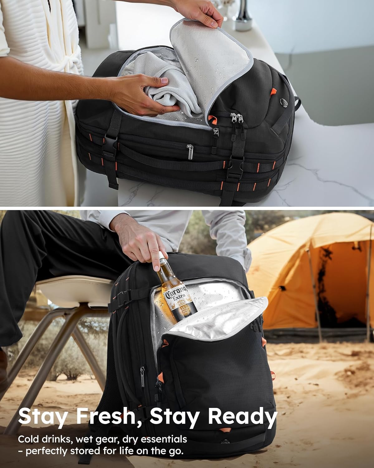 【Expandable 35L to 45L Versatility】Pack just right every time. Expand from 35L to 45L to suit your schedule – commutes, gym sessions, or 3-5 day getaways. With dual main compartments, waterproof aluminum-lined wet/dry dividers, and smart internal organization, this expandable versatile travel backpack keeps everything in place without feeling bulky.