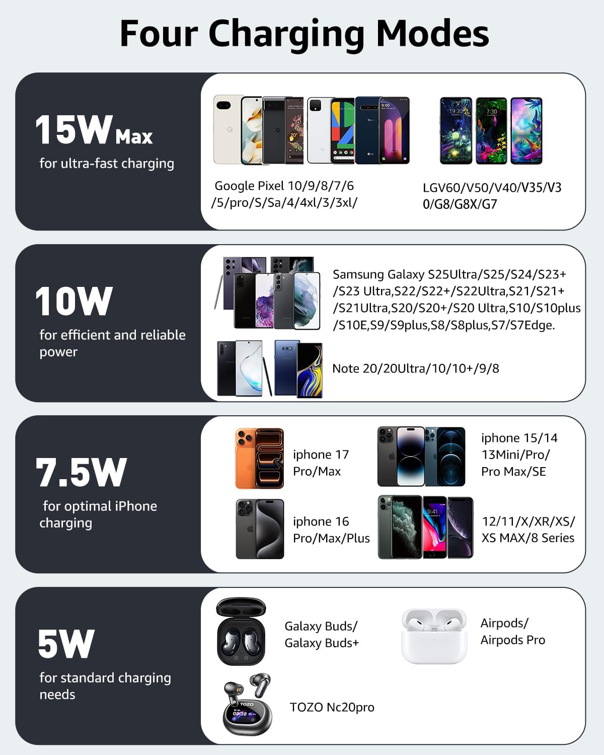 【Compatible with iPhone and Android Devices】Enabled wireless charging devices or devices with receivers, such as compatible with iPhone 17/17 Pro/17 Pro Max/Air/16/16 Plus/16 Pro Max/15/15 Plus/15 Pro/15 Pro Max/14/14 Plus/14 Pro/14 Pro Max/13/13 mini/13 Pro/13 Pro Max/iPhone 12/12 mini/12 Pro/12 Pro Max, compatible with Samsung Galaxy S25/S24/S23/S22/S21/S20/ S20+/S10 and so on; 5W charging mode works on Any wireless-charging-enabled devices like Google Pixel 3/3XL/4XL and other wireless charging enabled phones.