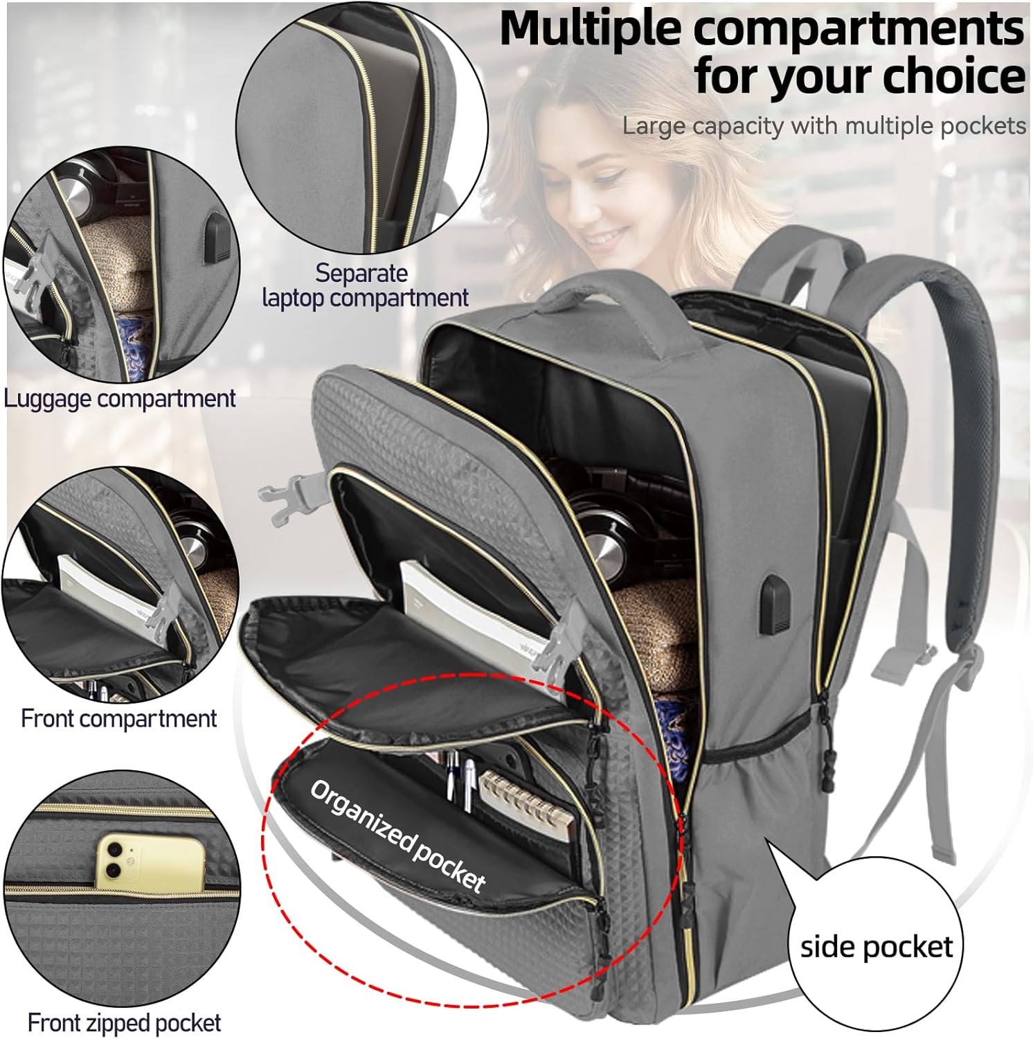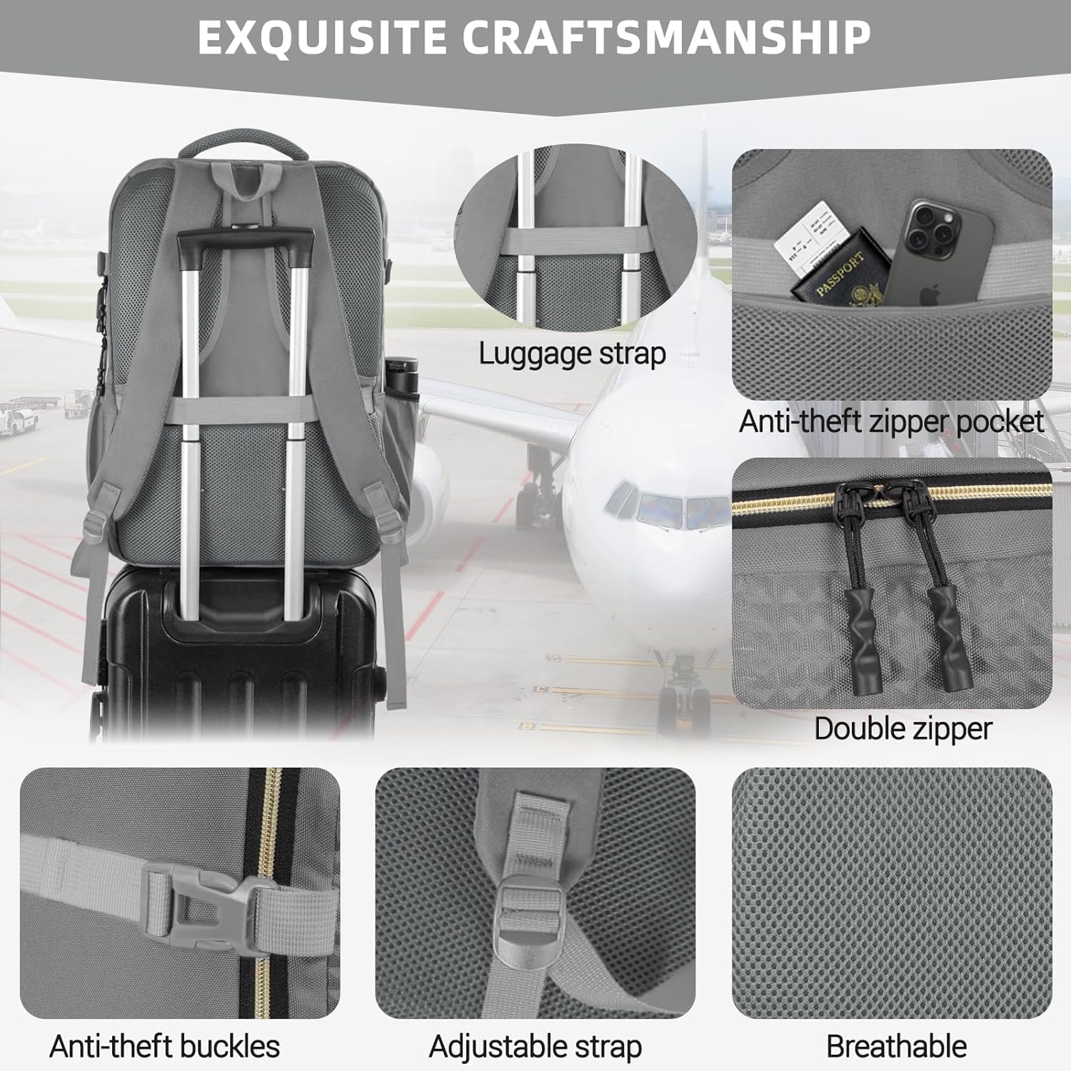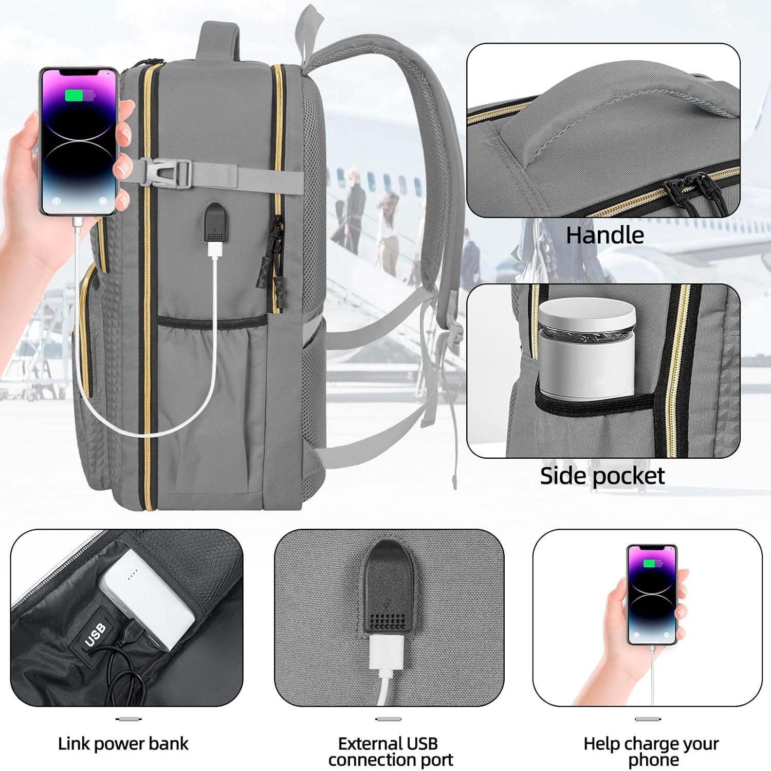 【Convenient USB Interface Design】: This women’s carry-on backpack is equipped with a USB charging port (power bank not included), so you can charge your phone or tablet while walking. The luggage strap on the back allows the backpack to slide over the suitcase handle to free your hands. Please note that this backpack is not self-powered, and the USB charging port only provides a convenient charging port.