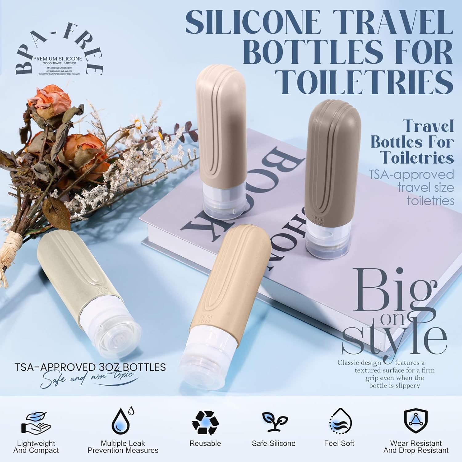 Travel Bottles for Toiletries – Your Perfect Travel Companion Elevate your travel experience with our innovative Travel Bottles for Toiletries, designed to make packing effortless and mess-free. Featuring Triple Leak-Proof Technology, each bottle boasts a three-layer leak-proof design that securely seals liquids, preventing spills and protecting your luggage and clothing. Say goodbye to messy backpacks and hello to worry-free travel! The Drip-Free Valve takes convenience to the next level. With a cap that precisely controls liquid flow, you can dispense just the right amount of your toiletries every time—no mess, no waste. Enjoy every drop of your essentials with this smart, no-drip technology. Crafted with a User-Friendly Design, these silicone bottles feature a wide opening for easy filling and refilling, even with thicker liquids, and fit seamlessly into a brush cleaning tube. Stay organized with four vibrant colors and interchangeable labels that attach to the lid’s groove, making it a breeze to distinguish between contents. Compact, durable, and stylish, our Travel Bottles for Toiletries combine practicality with peace of mind. Whether you’re jetting off on a weekend getaway or a long-haul adventure, these bottles ensure your toiletries stay secure and accessible. Pack smart—travel better!
