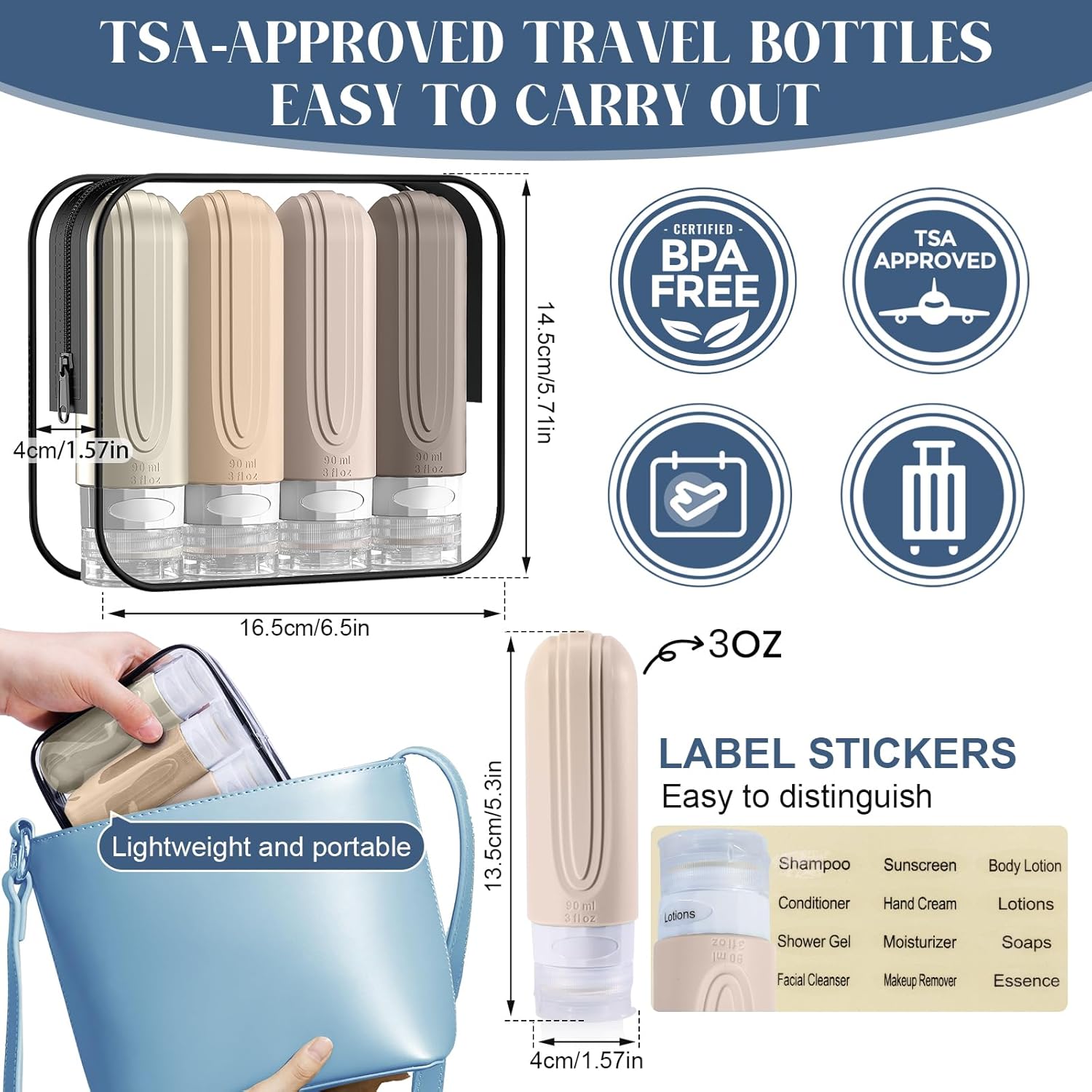 【TSA Approved Travel Bottles】These lightweight 3 oz Travel Size Toiletries are airplane travel essentials. They are the right size to fit into a backpack easily, and easy to carry so you can enjoy your toiletries anytime, anywhere.Their see-through quart-sized zip pouch will make your security check-ins stress-free and fast