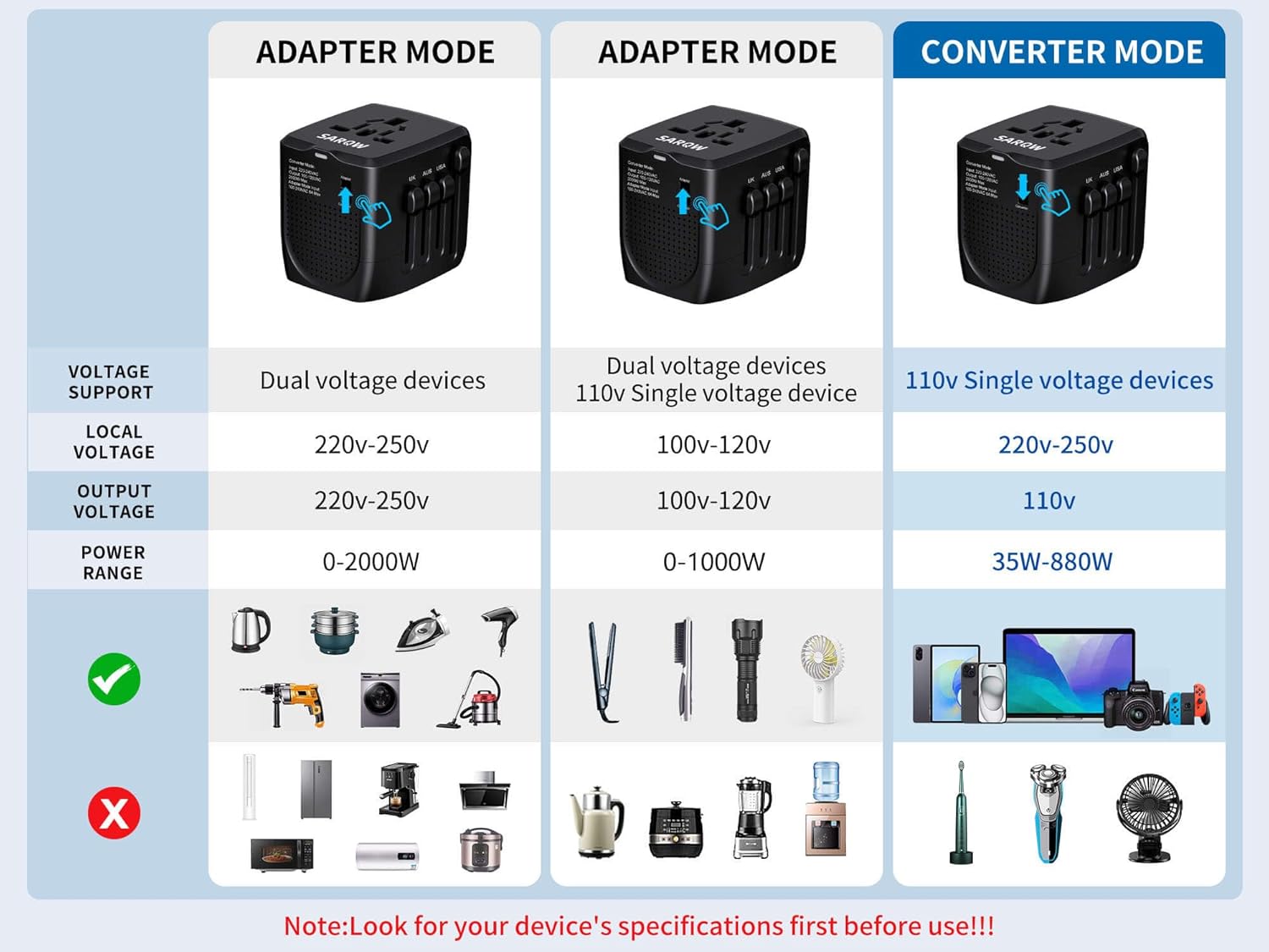 220 V to 110 V converter: This power converter reduces the voltage from 220 / 240 V to 100 / 120 V and is suitable for electrical products from 25 W to 880 W, with a maximum power of 240V/2000 W in adapter mode