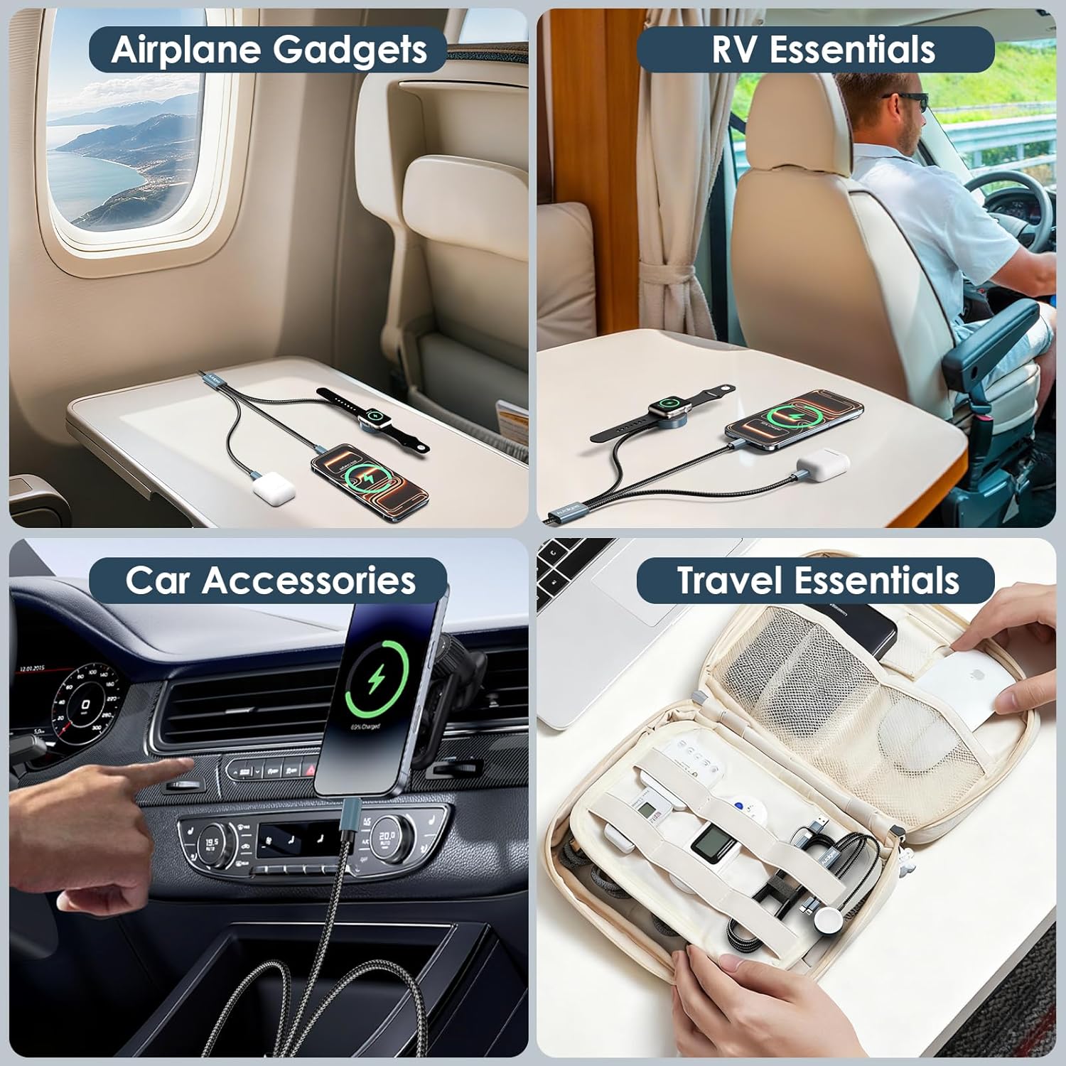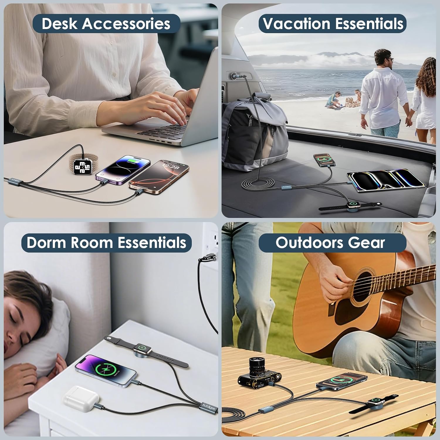 ⌚Travel Gadget & Space Saving: Lightweight and portable design, the multi charger can be used for home/office/trip/car/sports, etc. When weekend getaway it allows me to connect multiple devices without carrying around a tangle of cables. Doesn’t take up much space and keeps your book bag purse tidy.We also provide a strap for the iphone charging cable to roll up the cable for storage.