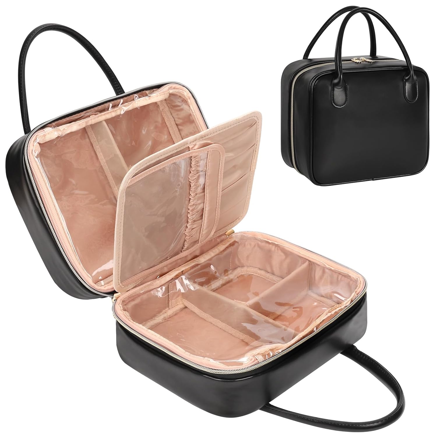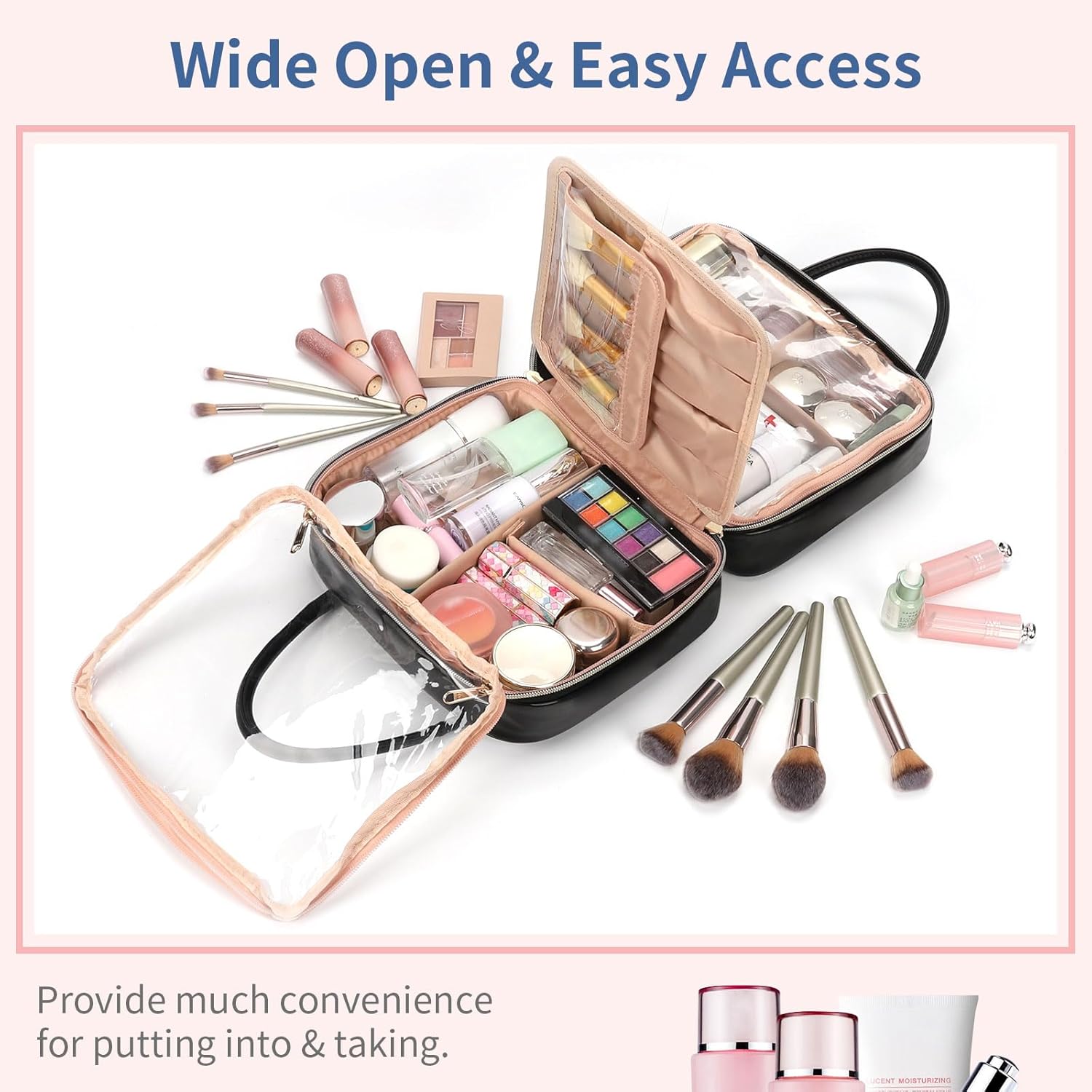 Easier Access Design: The large opening design allows the bag to be opened quickly, making it easy to take out and store items. Waterproof transparent PVC allows you to see all of your makeup, internal partitions prevent cosmetics from moving. Portable handles, easy to carry.