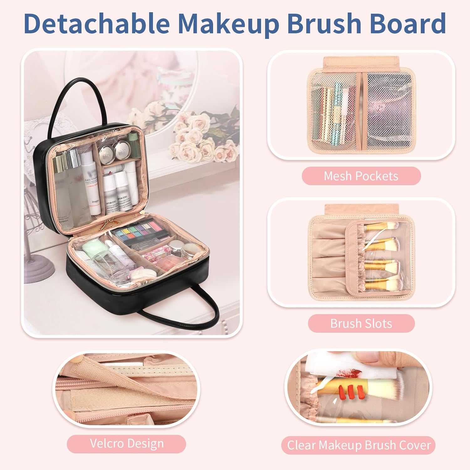 Multi Compartments Storage: Travel cosmetic bag has two large main compartments and one separate makeup brush board, which one side has 4 makeup brush slots and transparent PVC cover to protect your brush from dust, two mesh pockets of another side can hold small items. The bag comes with four detachable flexible partitions, can adjust space as needed for better organization of items.