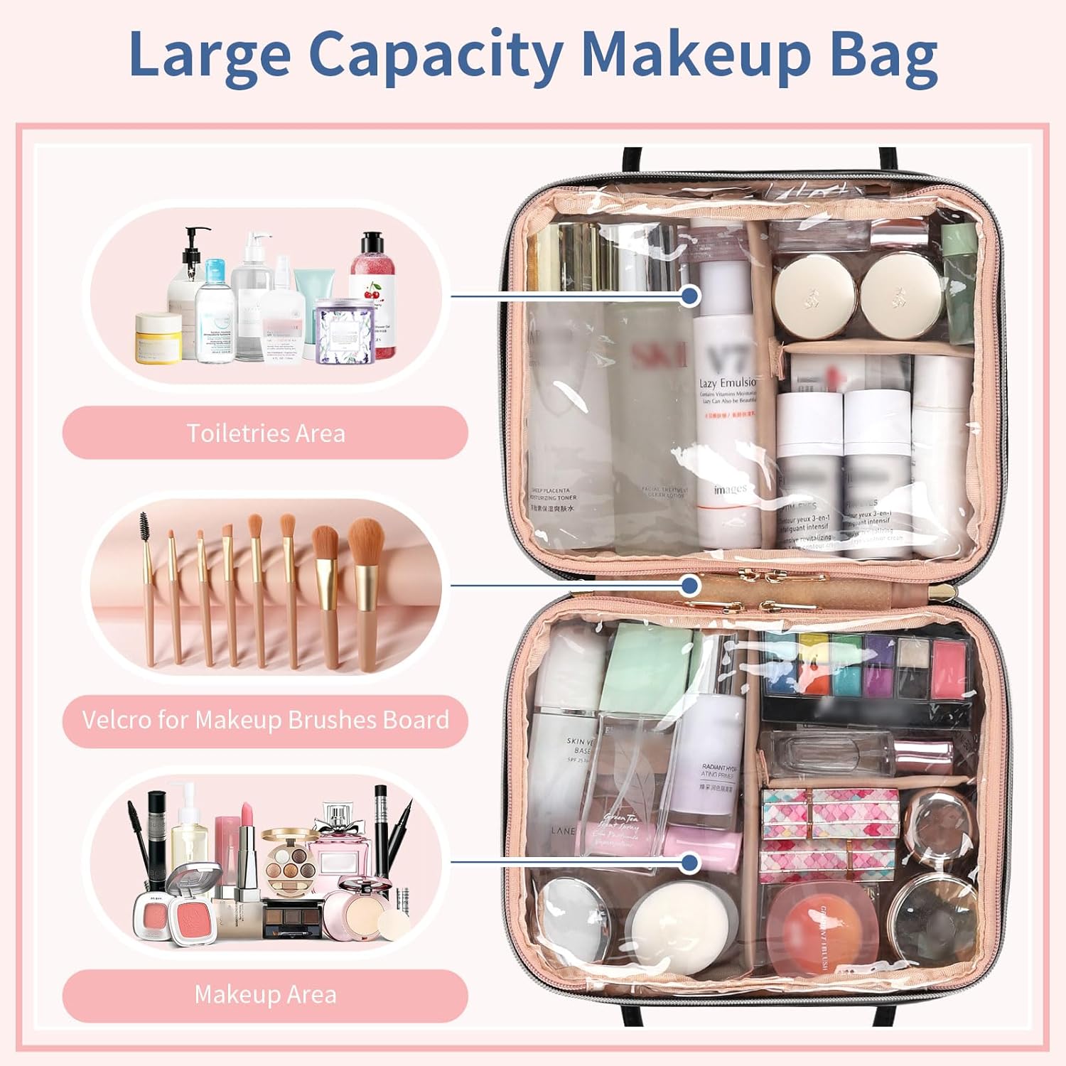 Travel Makeup Bag, Large Capacity Cosmetic Bag, Portable Make Up Bag Organizer for Women, Waterproof Cosmetic Travel Bag with Dividers and Brush Compartment for Cosmetics & Toiletries