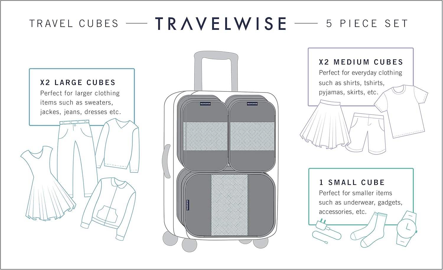 Wrinkle control & compact storage — Keeps items from shifting in transit to reduce wrinkles. When unused, cubes nest into each other for easy storage.