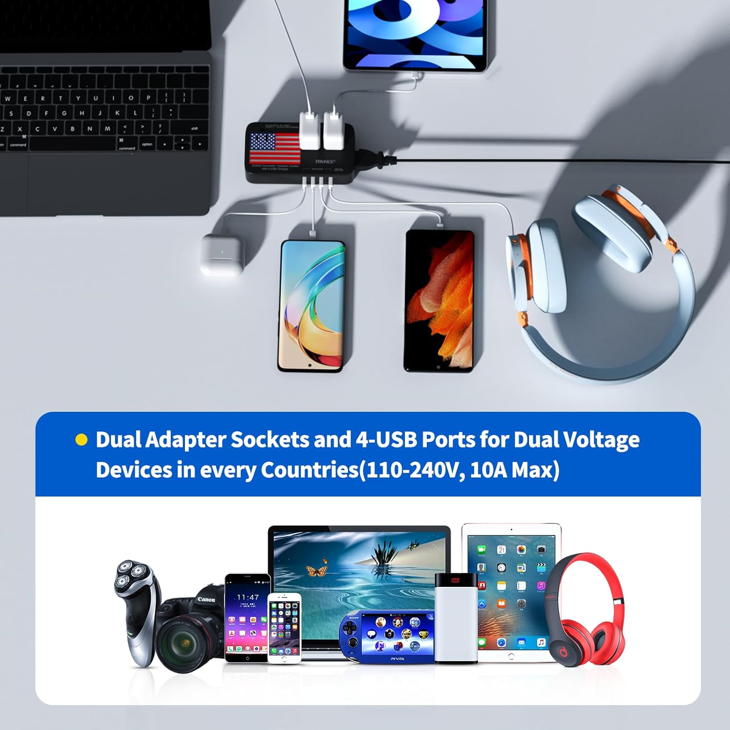 ✈✈✈【10A Dual Adapter Sockets & Smart 4-Ports USB】Adapter I and Adapter II sockets CAN NOT convert voltage.The TryAce adapter is suitable for all DUAL VOLTAGE devices(100V-240V,10A max) .Such as mobile phones/cemera batteries/apple watch/ ipad/ laptop/macbook/Dual voltage flat iron/Dual voltage curling iron/Dual voltage hair straightener). 4-Port USB compatible with almost all USB devices,such as cell phones,Bluetooth Speaker etc.