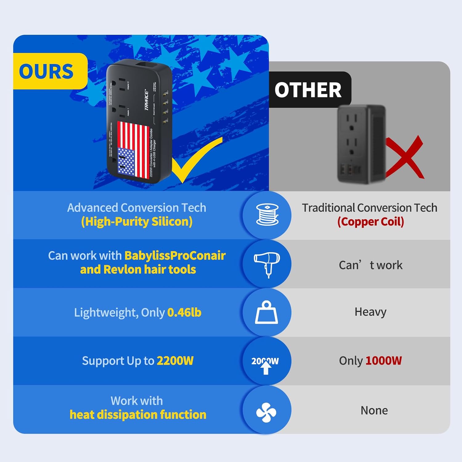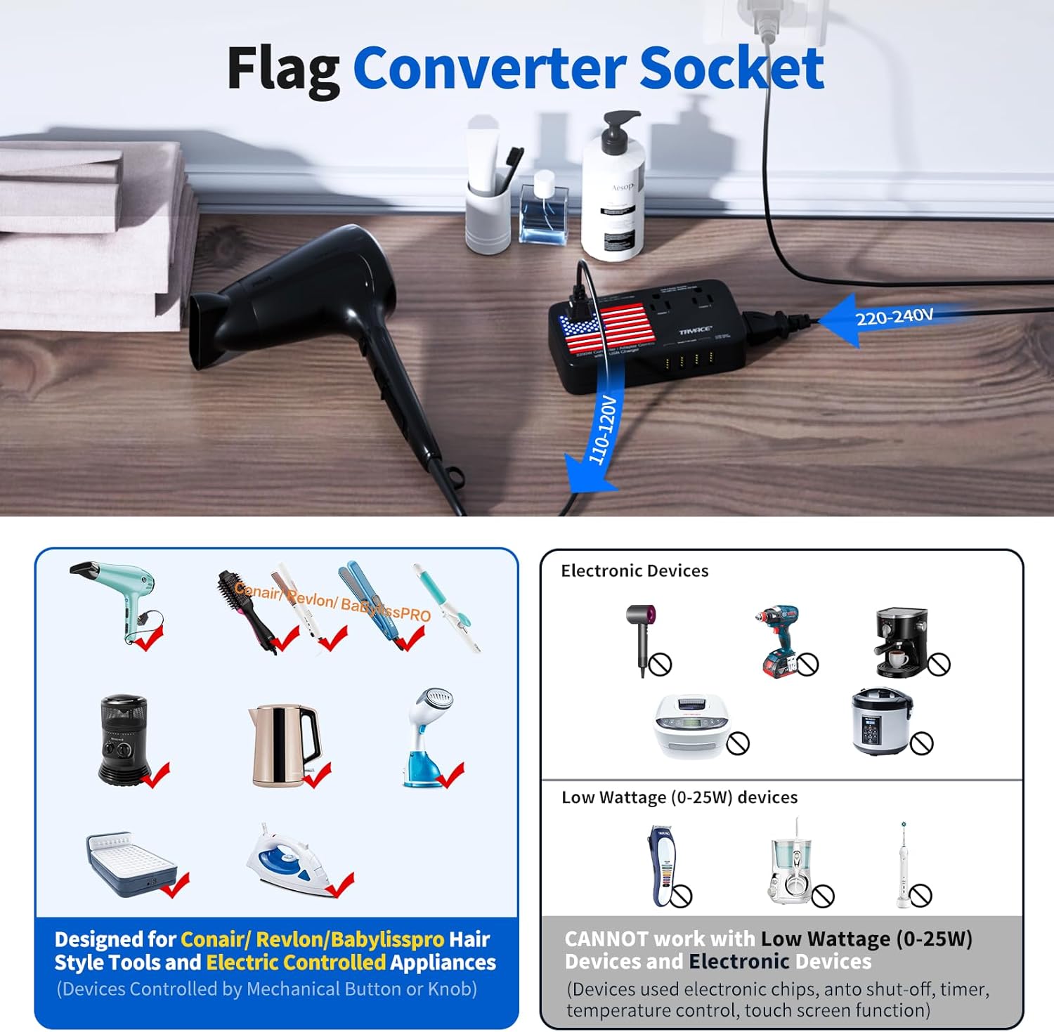 ✈✈✈【Exclusive Converter For Conair】TryAce power converter is designed for all brands of hair dryers(except Dyson) and Conair/Hair Tools(such as hair straighteners,flat irons,hair curlers).The Converter Socket is Only compatible with Single US Voltage (110V/120V/125V) devices that are Mechanically Controlled.Note:It can’t work for Coffee machine,drill battery,Blender and low-wattage appliances (0-25W), such as electric toothbrush and Hair Clipper etc.