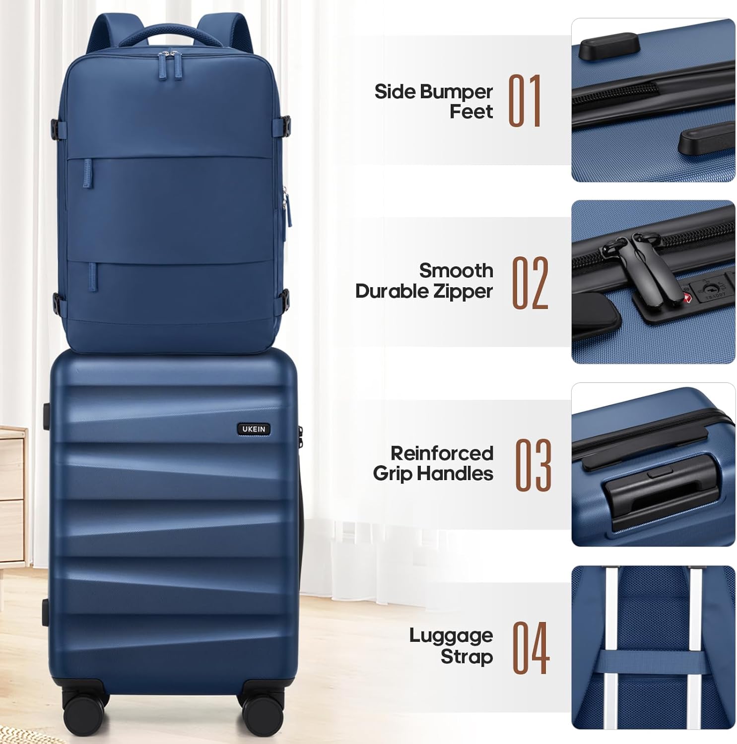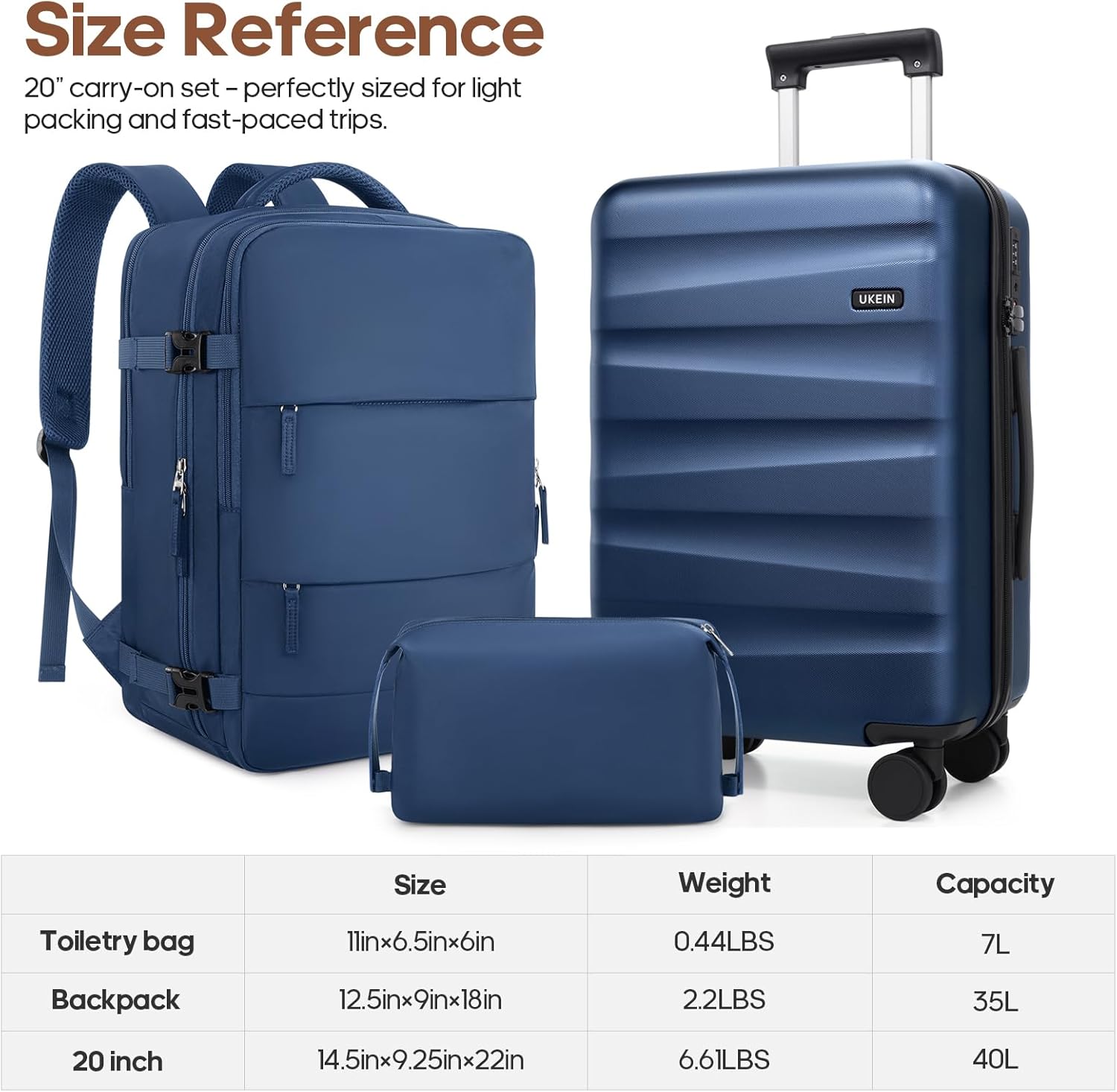 Luggage with Backpack Set : The UKEIN 20-inch carry-on luggage is designed to fit comfortably in overhead bins on almost any flight. Paired with a matching backpack for carrying your in-flight essentials, while the large toiletry bag helps you stay organized with all your travel necessities. Ideal for both business and leisure trips, this suitcase set offers a practical and stylish solution for any traveler.
