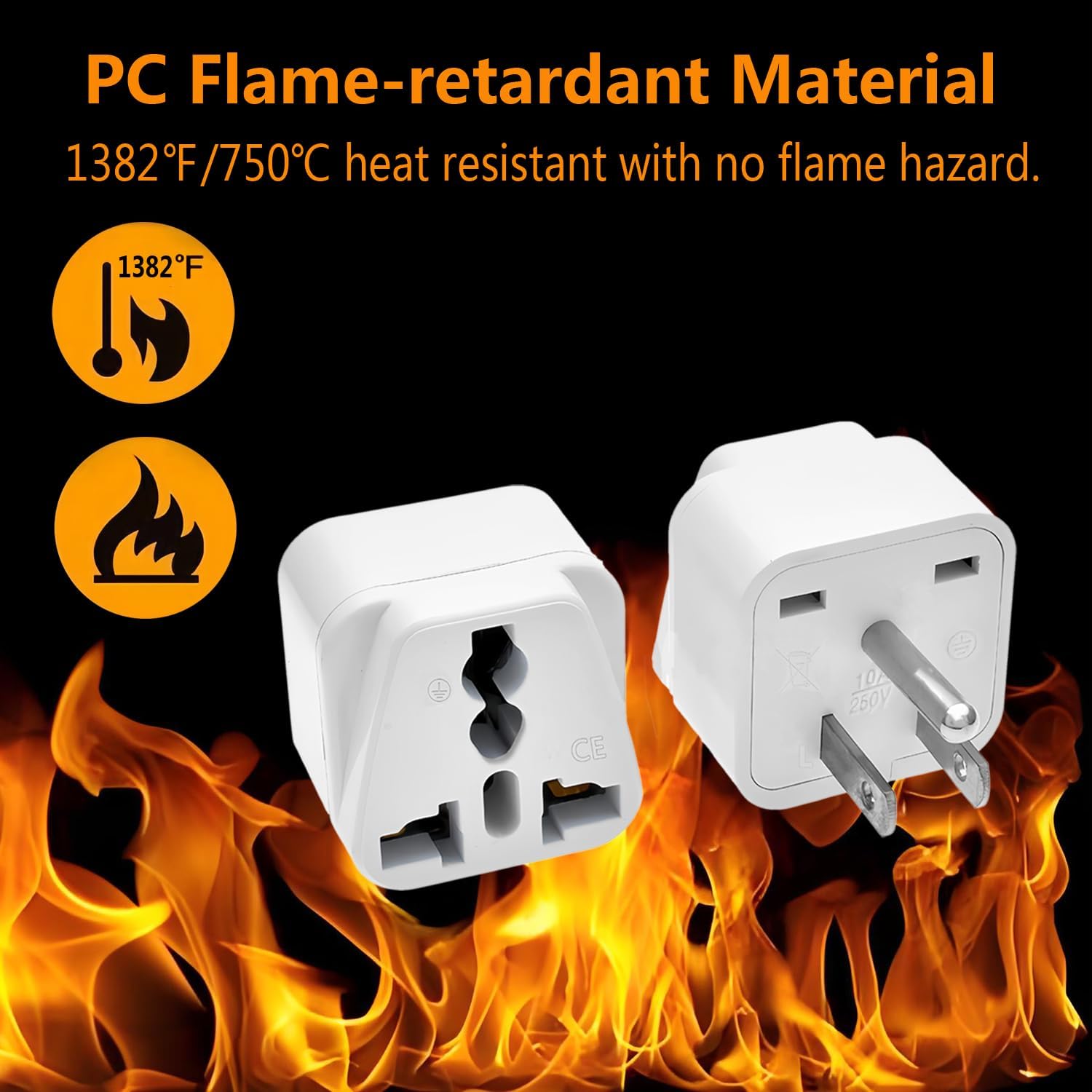 Premium Quality Electrical Adapter : CE Listed. Our universal adapters are made of fire-proof material PC that is high temperature-resistant up to 1382℉/750℃. With high strength, good toughness, no deformation, high-temperature resistance, and no safety risks. Voltage current: 10A / 125 ~ 250 V. Maximum power: 1250W at 125V