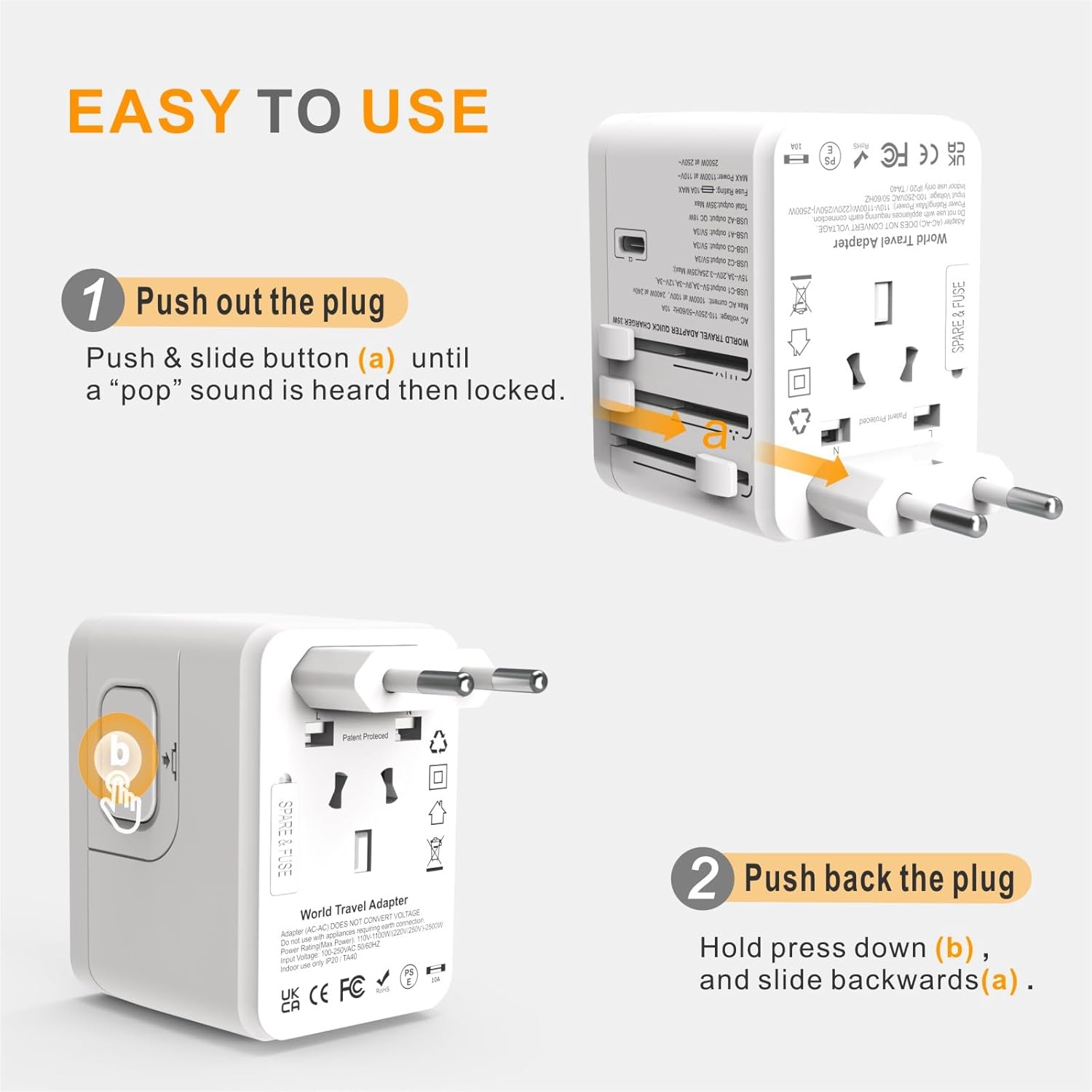 With compact and ultra-light weight design, this universal travel adapter is properly to put in any bags, suitcase and easy to carry out.Take it with you and embark on your adventure, without worrying about adding extra burden. It will be an excellent travel companion for your global journey and easy to use.