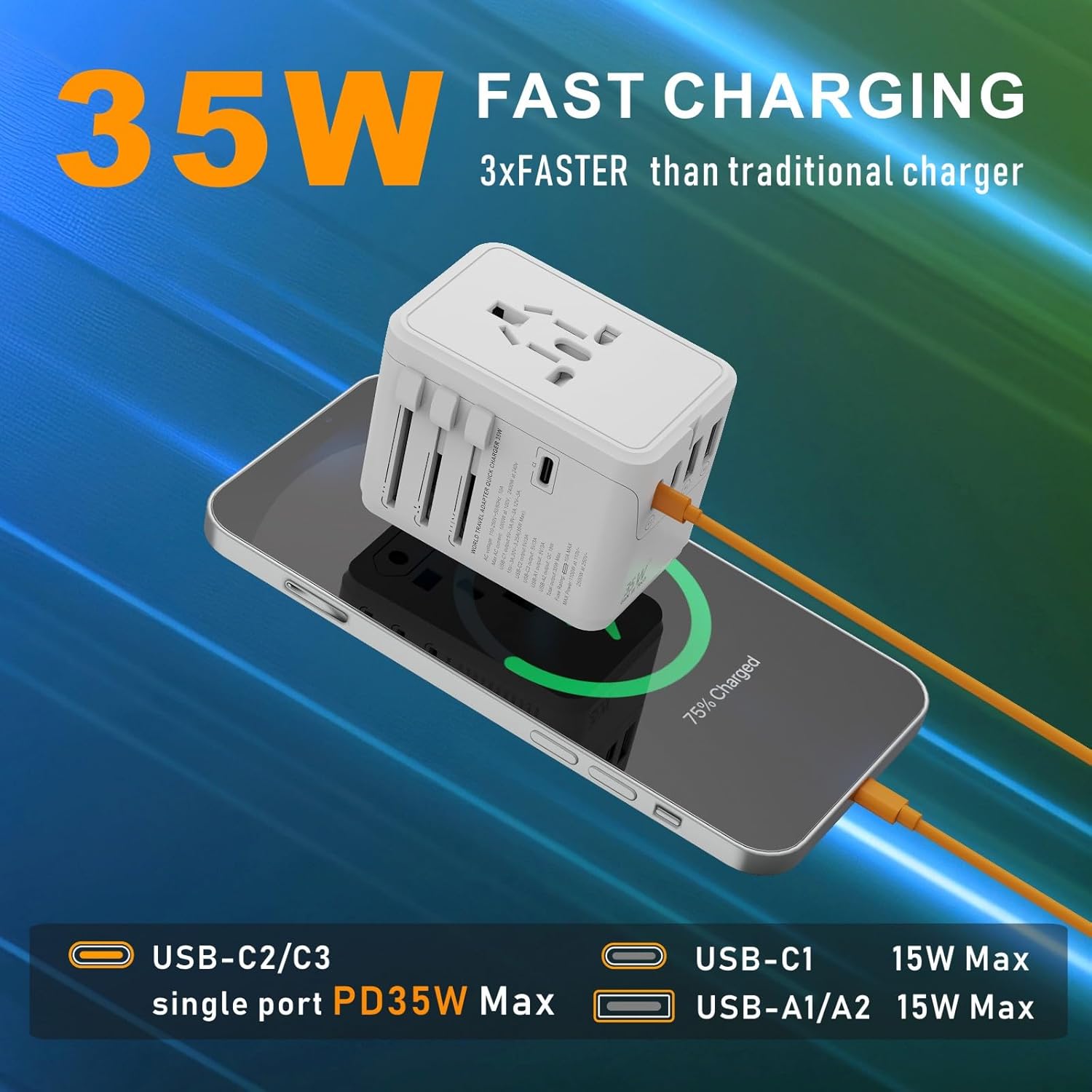 Universal Travel Adapter Worldwide- 35W GaN III/PD Fast Charge European Travel Plug Adapter with 3 USB-C& 2 USB-A Ports, International Power Adapter for US to Europe UK AUS Japan(Type C/G/A/I) (white)