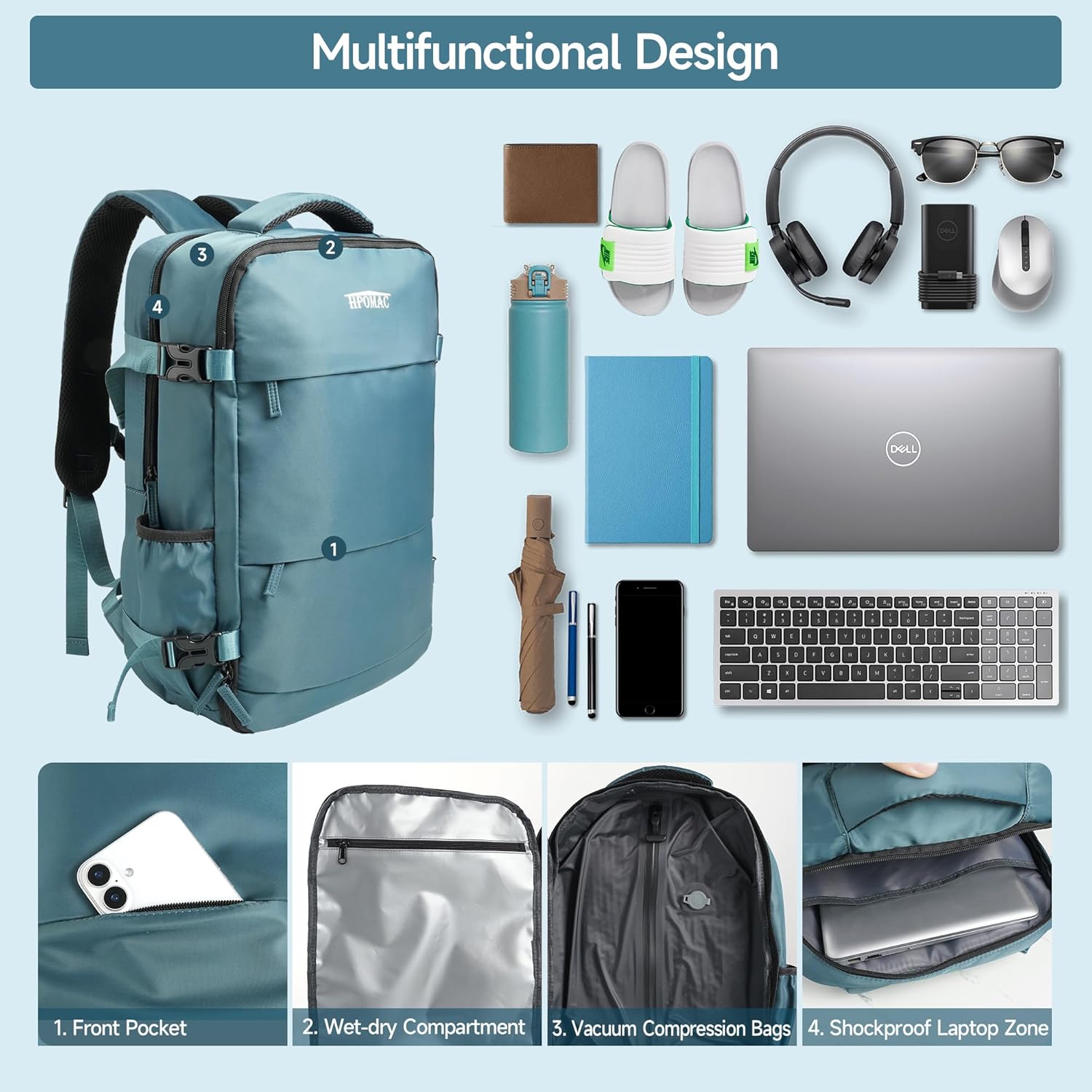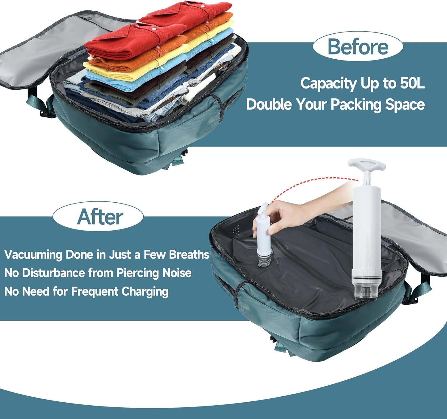 Vacuum Backpack Travel 50L, Carry On Compliant Backpack Water-Resistant, Fits 17-Inch Laptop & 1 Week Gear, Expandable Compression System, Vacuum Pump Included, Gifts for Women & Men Travelers, Teal